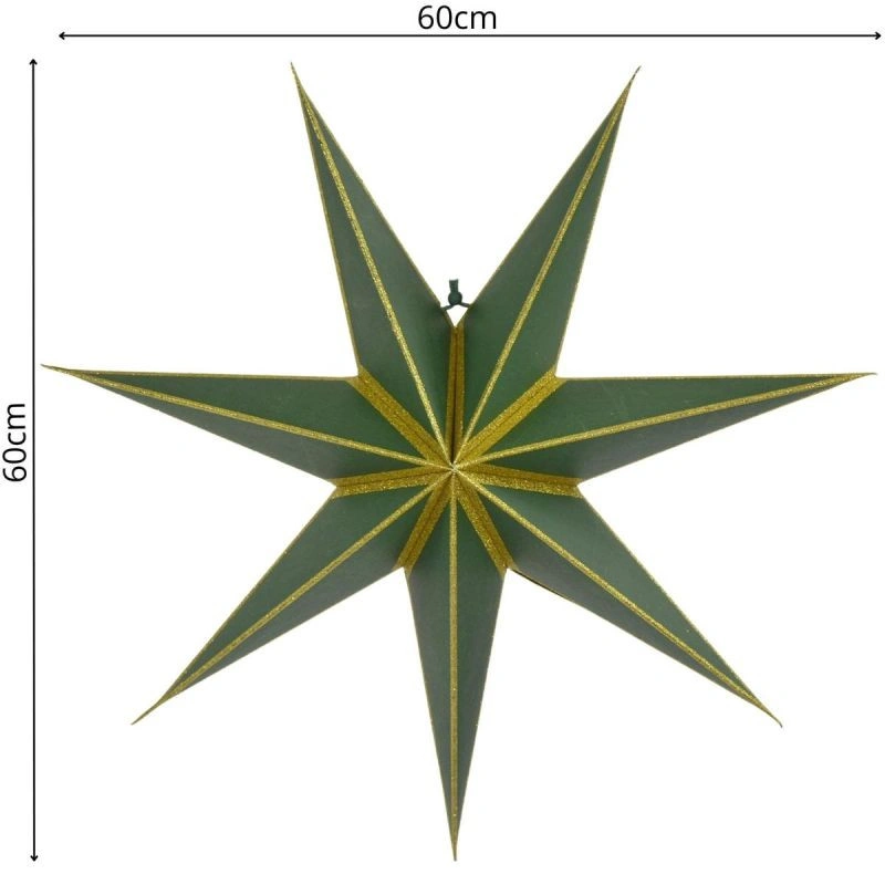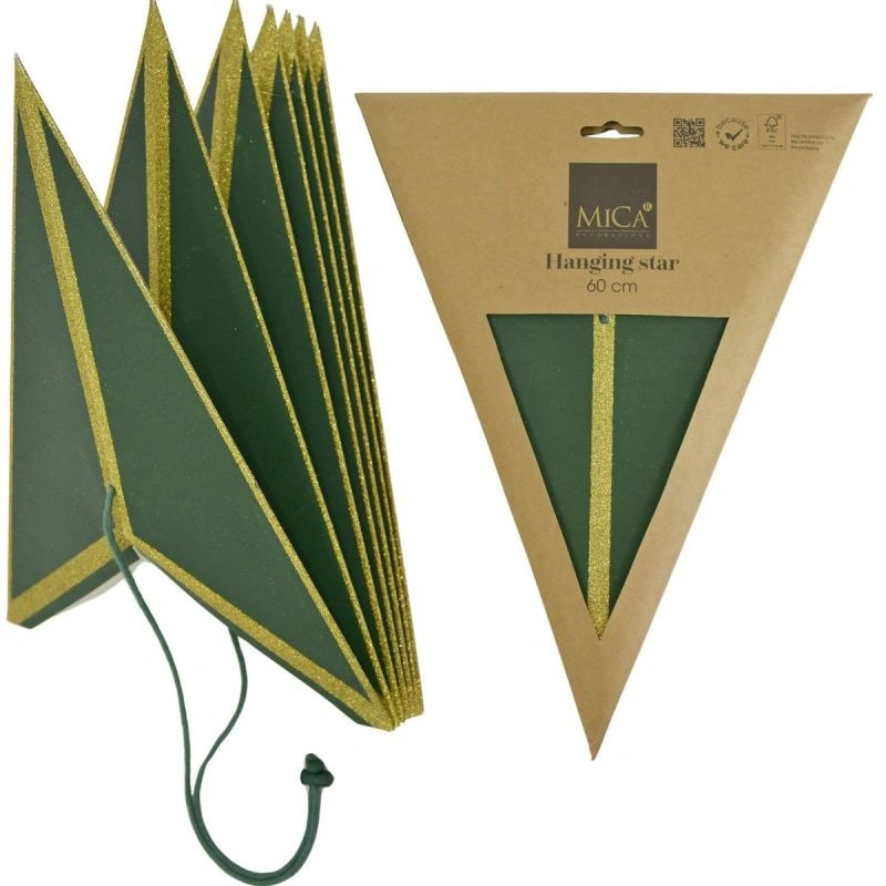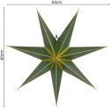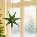 Vyberte si dekorativní papírovou hvězdu od společnosti MICA - elegantní zelenou dekoraci s působivým průměrem 60 cm a výrazným geometrickým tvarem. Je vyrobena z papíru s certifikátem FSC, je skládací a lze ji opakovaně použít, takže se bude skvěle hodit k zavěšení do okna, nad stůl, do obývacího pokoje nebo do výlohy.