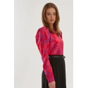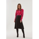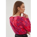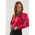 Halenka s krásnými růžovými květy, vyrobená ze saténové látky. Má dlouhé rukávy s jemným puffem a kulatý výstřih. Halenka se vzadu zapíná na ozdobné knoflíky. Skvěle se hodí do soupravy se sukní a kalhotami. Tento model oživí každý styling. Modelka na fotografii je vysoká 174 cm a nosí velikost 36.