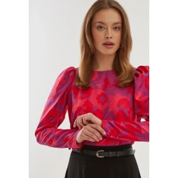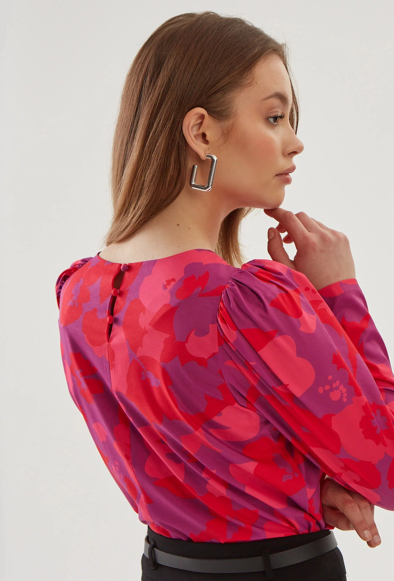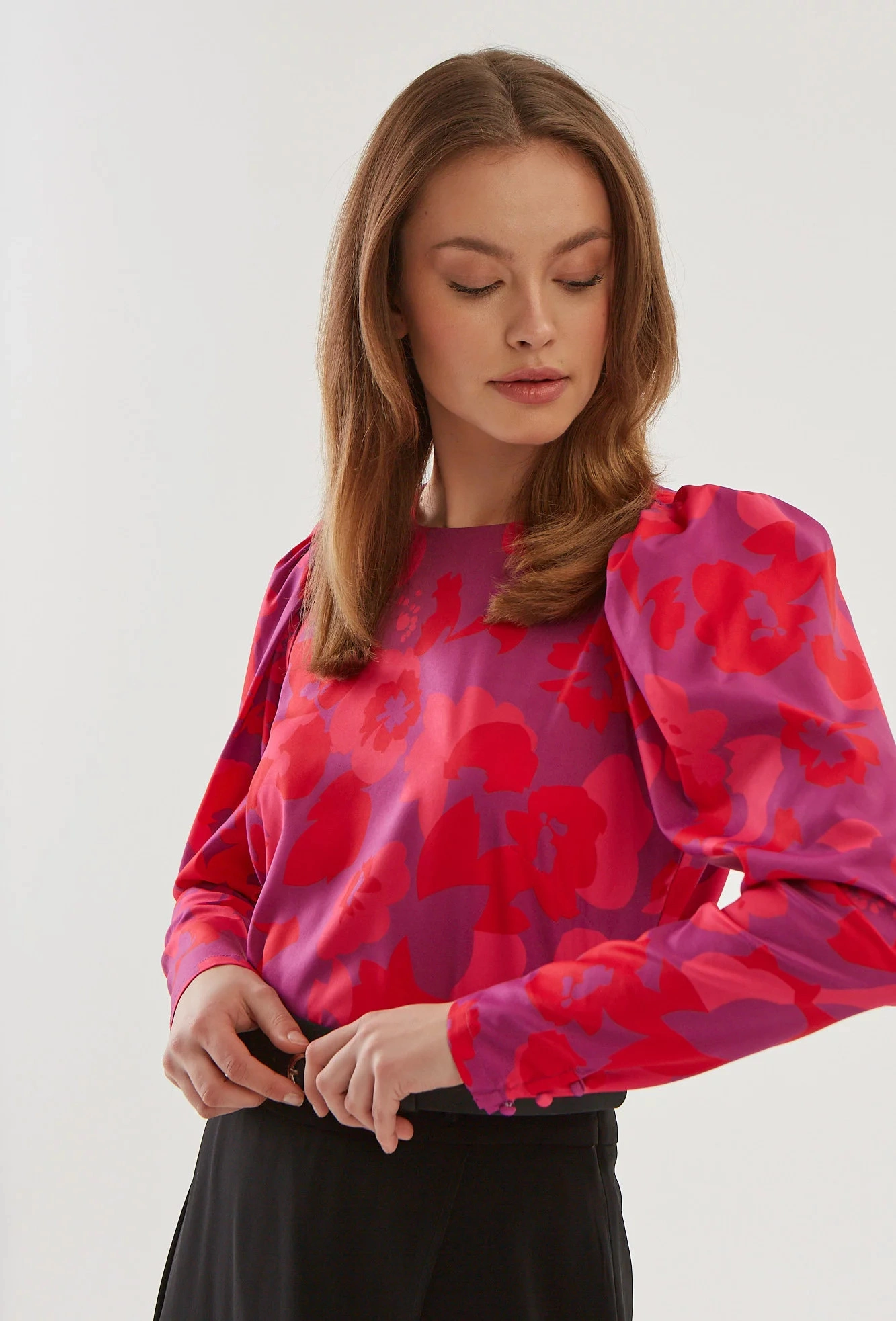 Halenka s krásnými růžovými květy, vyrobená ze saténové látky. Má dlouhé rukávy s jemným puffem a kulatý výstřih. Halenka se vzadu zapíná na ozdobné knoflíky. Skvěle se hodí do soupravy se sukní a kalhotami. Tento model oživí každý styling. Modelka na fotografii je vysoká 174 cm a nosí velikost 36.