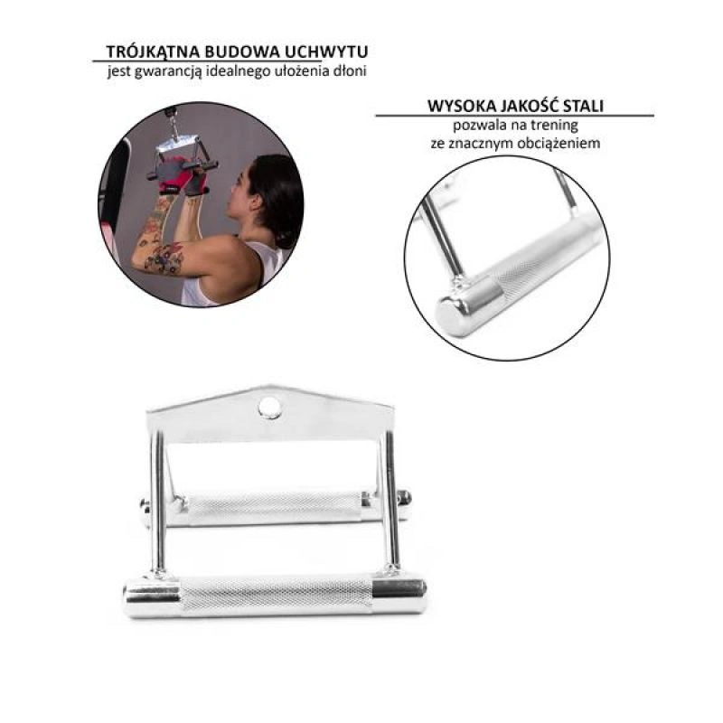 Trojúhelníková konstrukce rukojeti zaručuje dokonalé umístění ruky a zároveň nutí ke správnému pohybu při cvičení. Ocelová, zdrsněná rukojeť zajišťuje bezpečný úchop a zabraňuje vyklouznutí činky z ruky, zároveň vyžaduje silnější úchop. To také pomáhá rozvíjet svaly předloktí. Nepříliš velká vzdálenost mezi rukojeťmi usnadňuje udržení správné dráhy pohybu, tj. udržení loktů blízko trupu. Je vyrobena z kvalitní oceli a umožňuje trénink se značnou zátěží.
