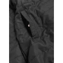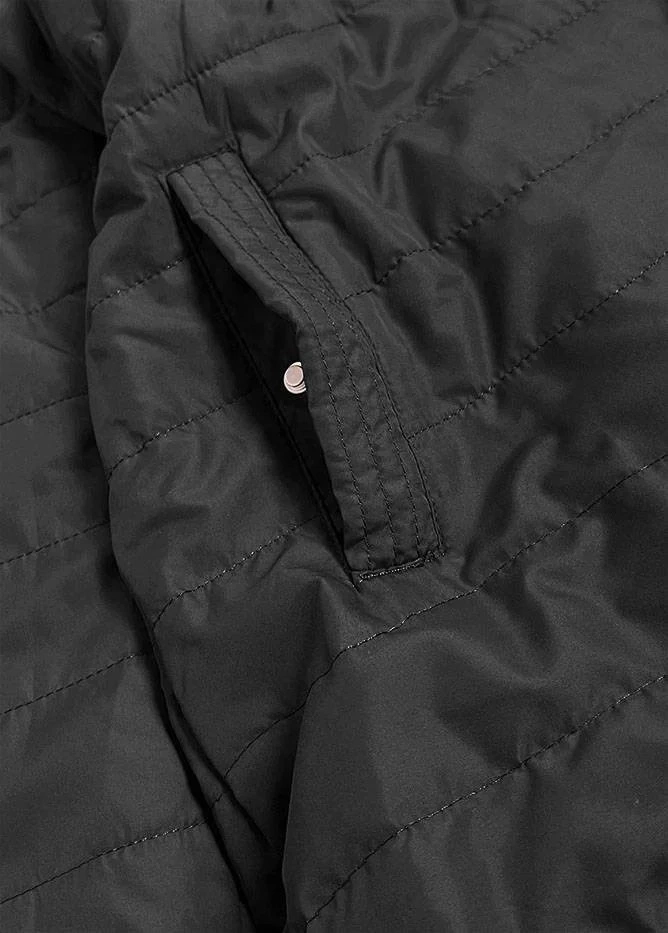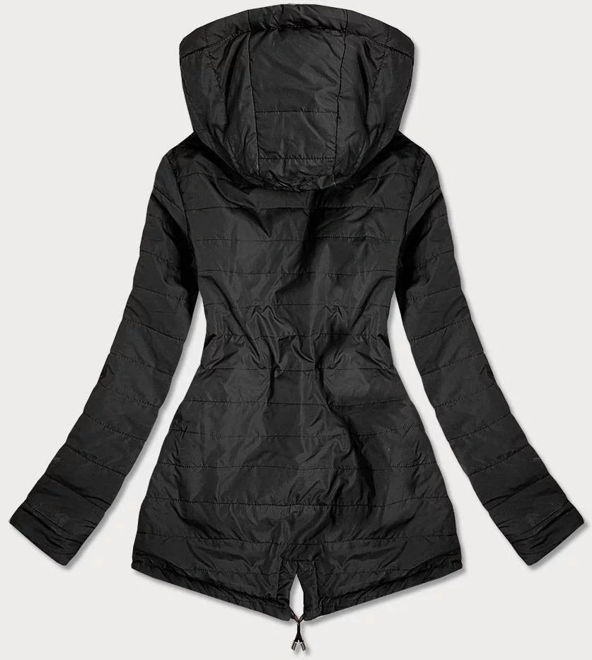 Bunda je zateplená tenkou vrstvou syntetické péřové výplně. Jedna strana bundy je hladká a druhá lehce prošívaná. Model má kapuci, kterou je možné odepnout. Bunda se zapíná zipem a panelem s patentkami. V pase modelu je stahující šňůrka. Model má dvě kapsy. Bunda má vzadu malý rozparek a stahující šňůrku. Patentky mají stříbrnou barvu.