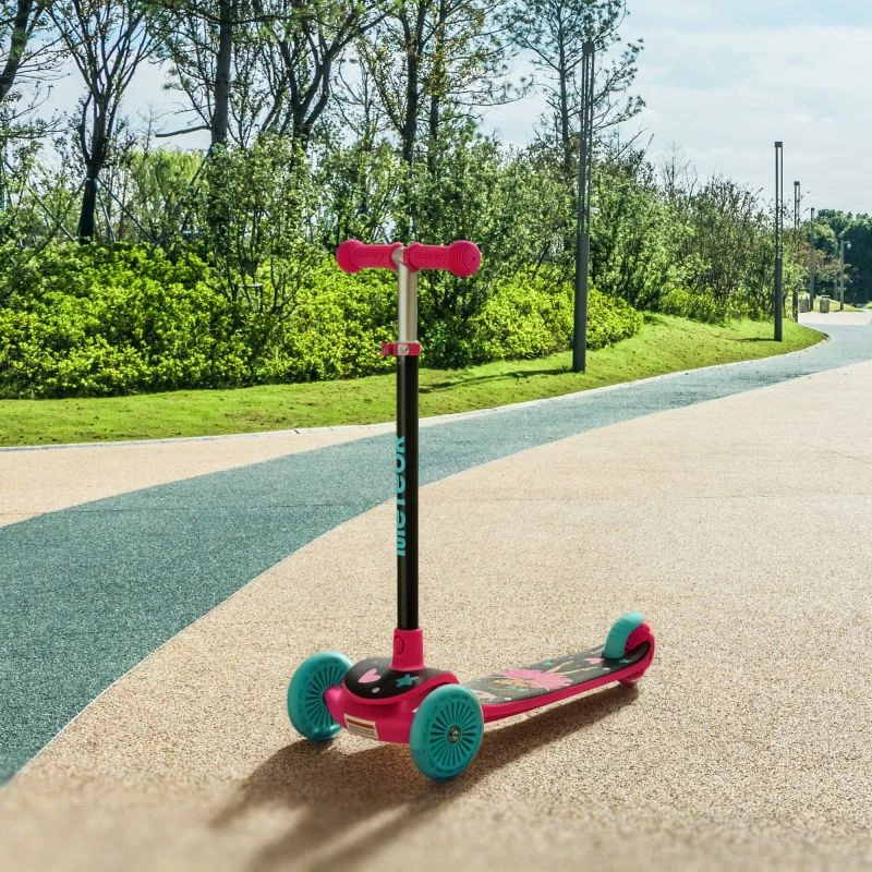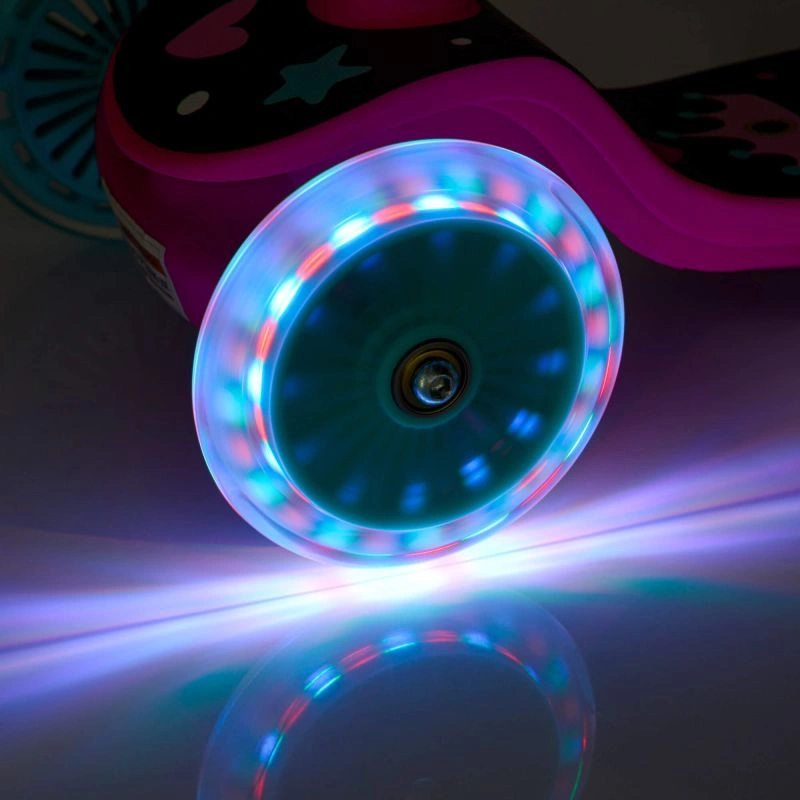Bezpečná jízda - tříkolová konstrukce s velkým rozchodem předních kol usnadňuje udržování rovnováhy a učení se jízdě. Nášlapná brzda na zadním kole umožňuje dítěti koloběžku rychle a účinně zastavit a svítící kolečka zlepšují viditelnost na silnici, čímž maximalizují úroveň bezpečnosti.
