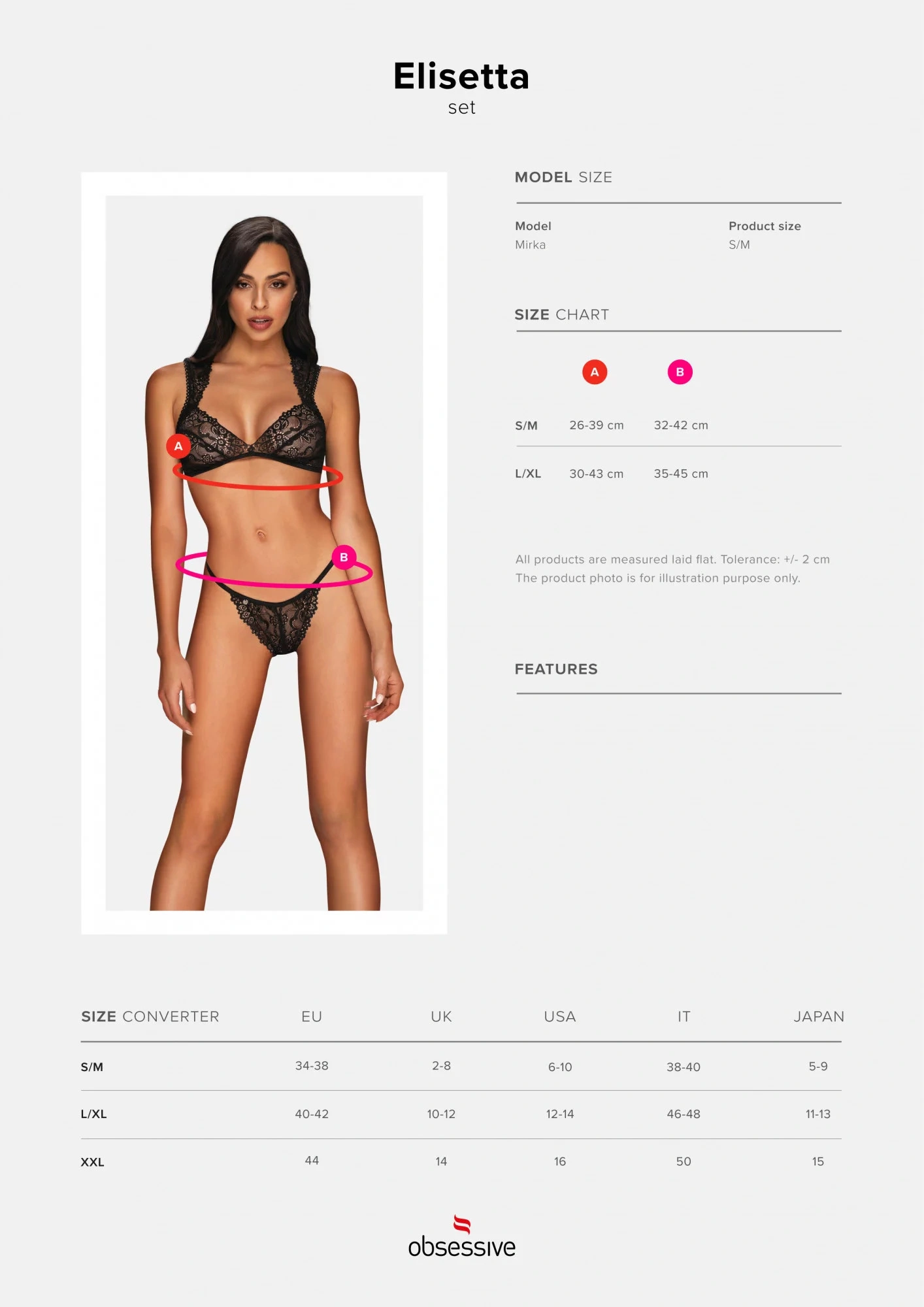 Co takhle malý výlet do země rozkoše? Tento sexy černý komplet z kolekce Elisetta je ideální volbou pro ženy, které mají rády jemnou krajku a zábavný doplněk v podobě třpytek. Jak se vám tato fantazie líbí? Jste připraveni ji uskutečnit?