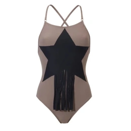 Dámské jednodílné plavky typu monokiny se zvířecím vzorem. Zavazování za krkem a na zádech. Zdobené