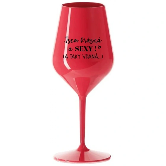 Nerozbitná červená vinná sklenice s motivem JSEM KRÁSNÁ A SEXY! (A TAKY VTIPNÁ...) je skvělá na zahradu, pláž, výlet, piknik a parádu udělá i při kempování. Jelikož je vyrobená z kvalitního polykarbonátu je de facto nerozbitná. Je to luxusní kousek, s nímž si víno můžete vychutnat prostě kdekoliv. Mají ergonomický tvar, který příjemně padne do ruky a protože je lehká, usnadňuje to její přenášení. Je snadno skladovatelná a lehce se čistí. Díky svému designu si s ní můžete vychutnat doopravdy kdekoliv bezproblémové pití výborného vína.