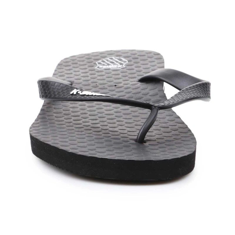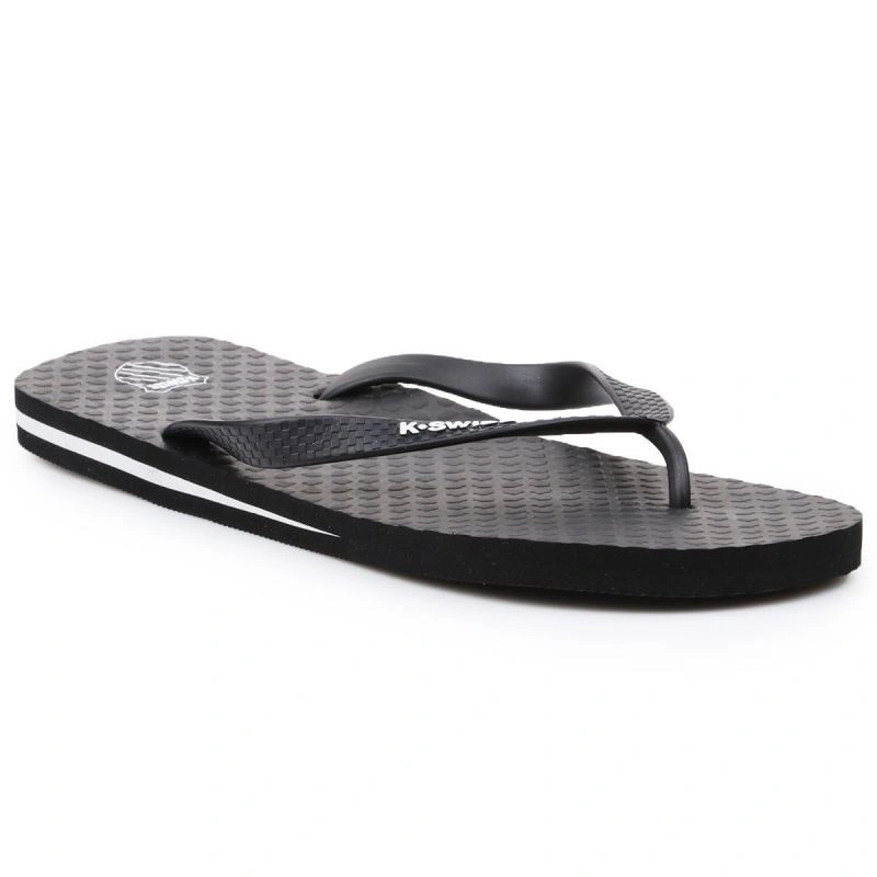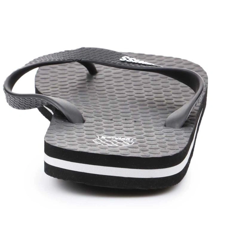 Pánské žabky značky K-Swiss. Ideální do sprchy, k bazénu, na pláž nebo kolem domu. Bílé logo K-Swiss kontrastuje s tmavým svrškem. Bílý pruh kolem svršku.