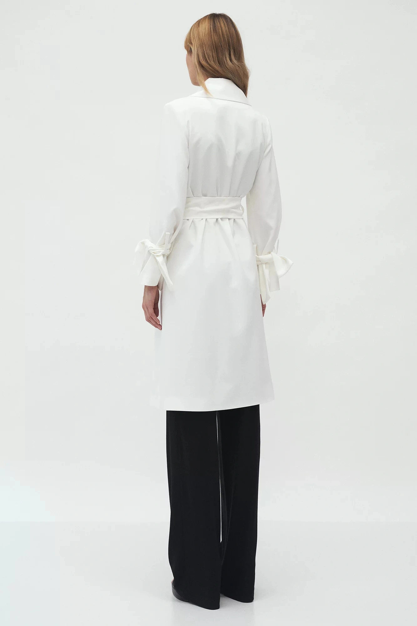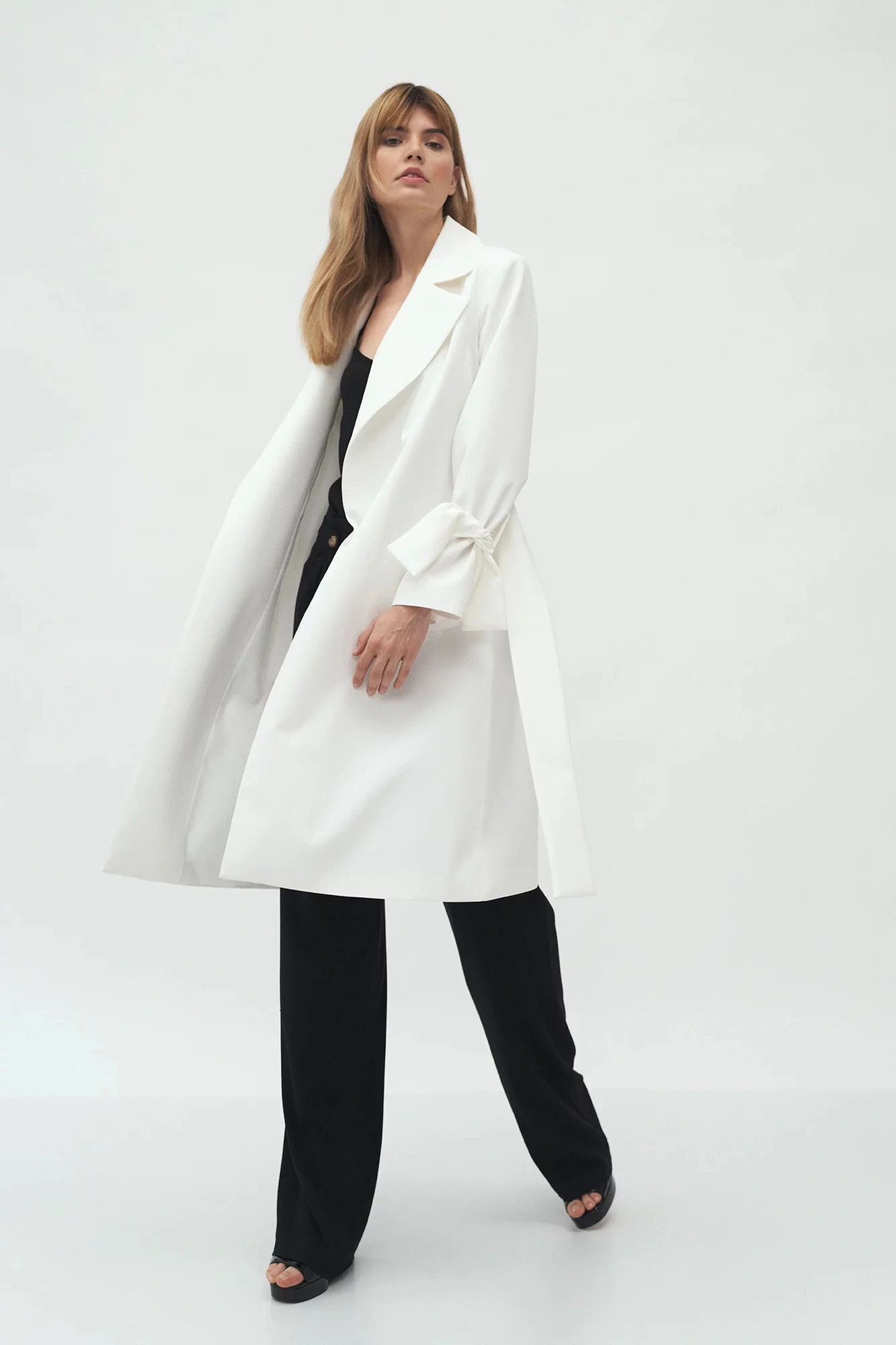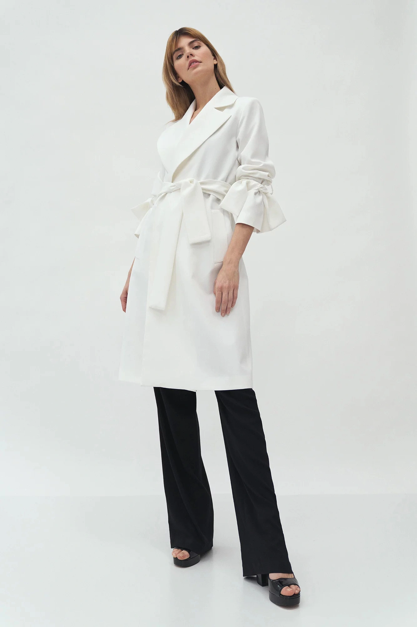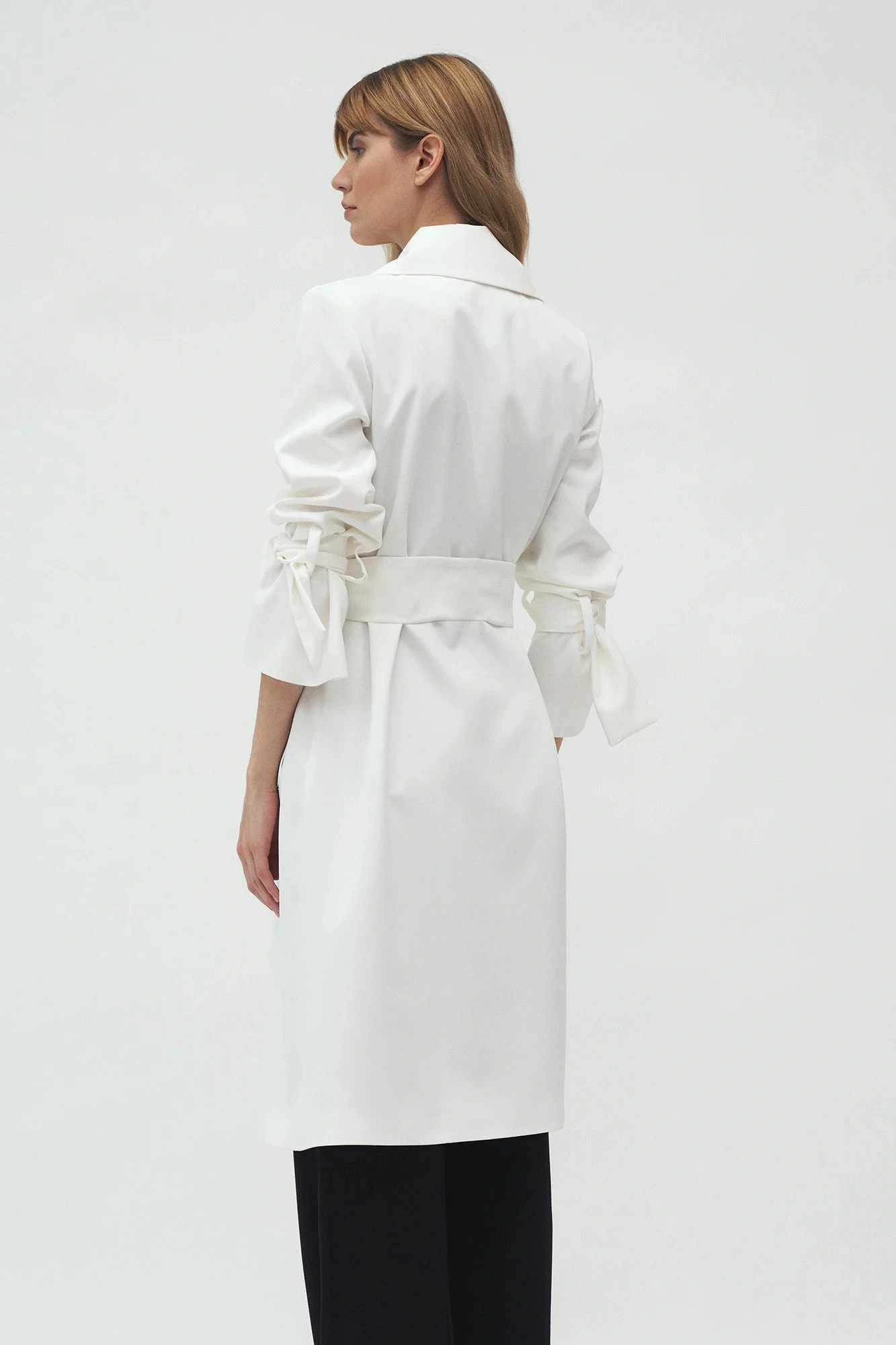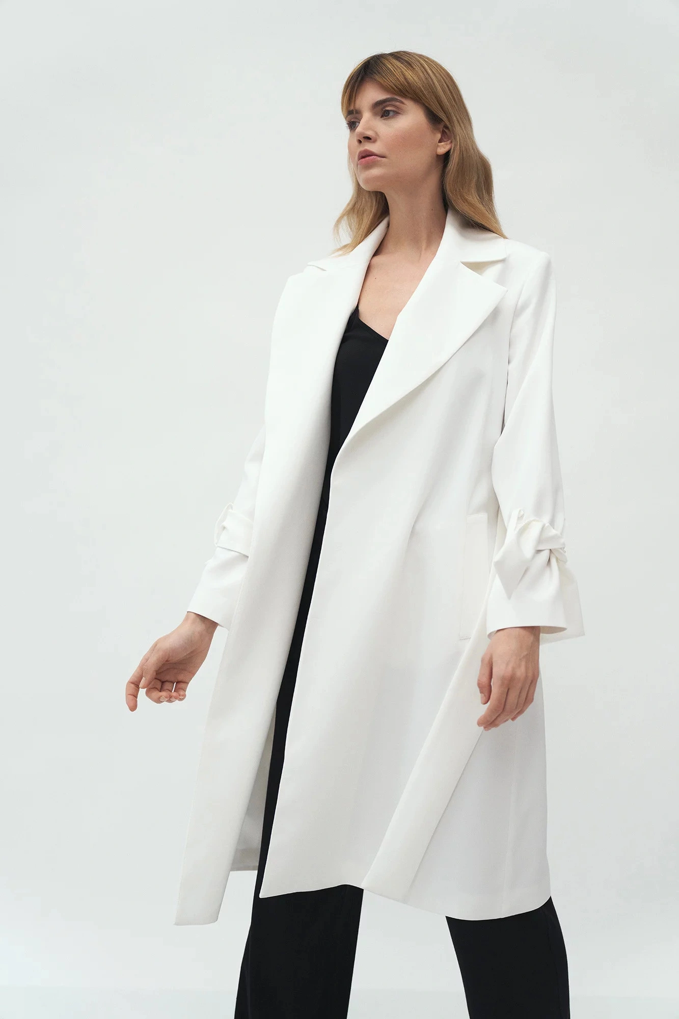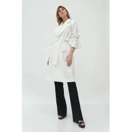 Kabát s délkou ke kolenům, páskem na zavázání v pase, širokými klopami a předními kapsami. Pásky na zavazování v manžetách umožňují upravit délku rukávů.100% polyesterBarva: ecruKolekce: Jaro/PodzimPohlaví: Ženské