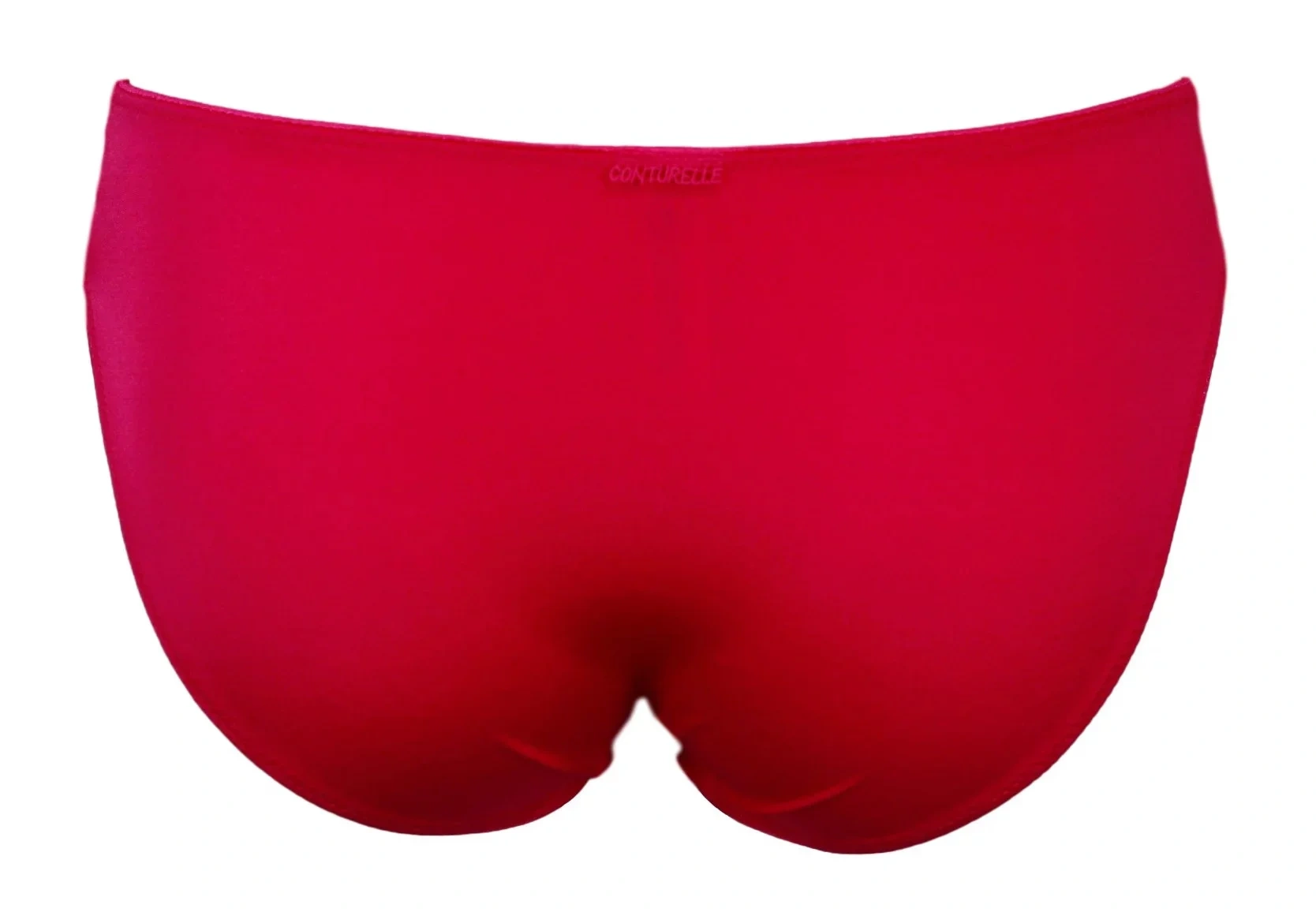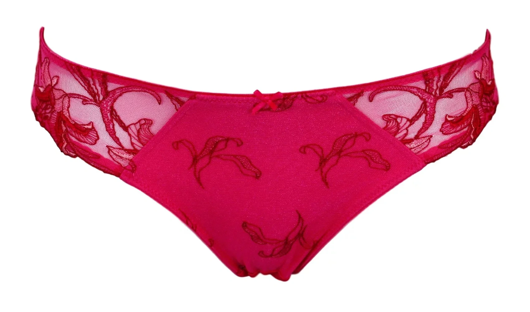 Tanga z pružného materiálů, zatímco boky jsou z elastické krajky, která byla také použitá pro zdůra