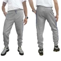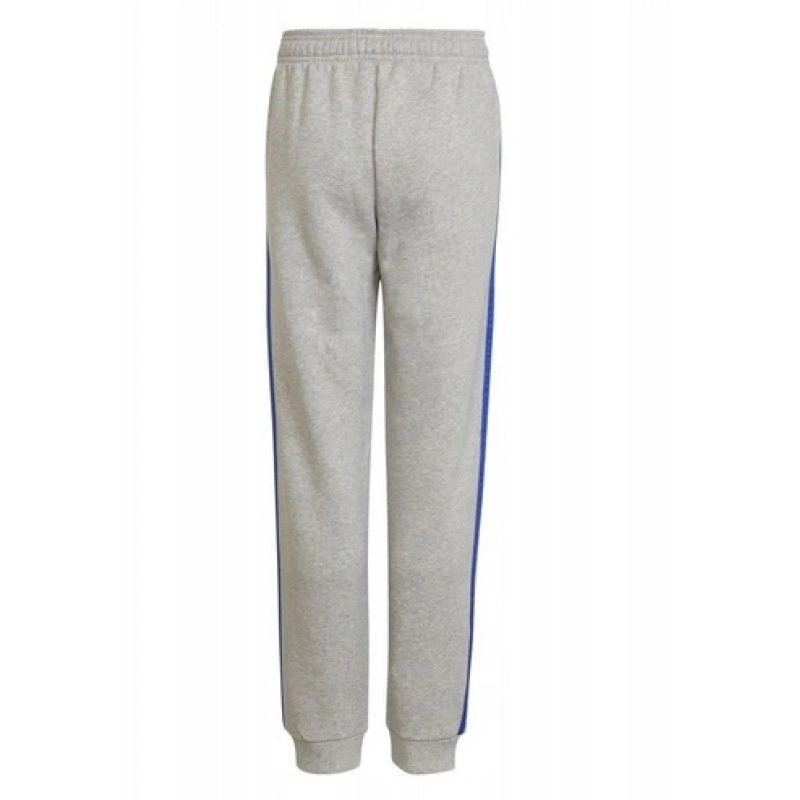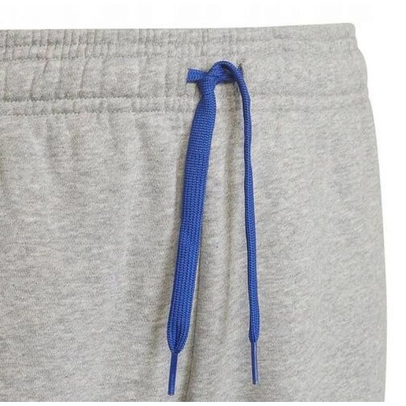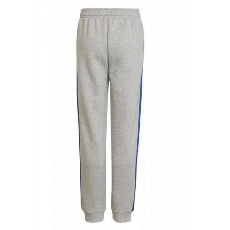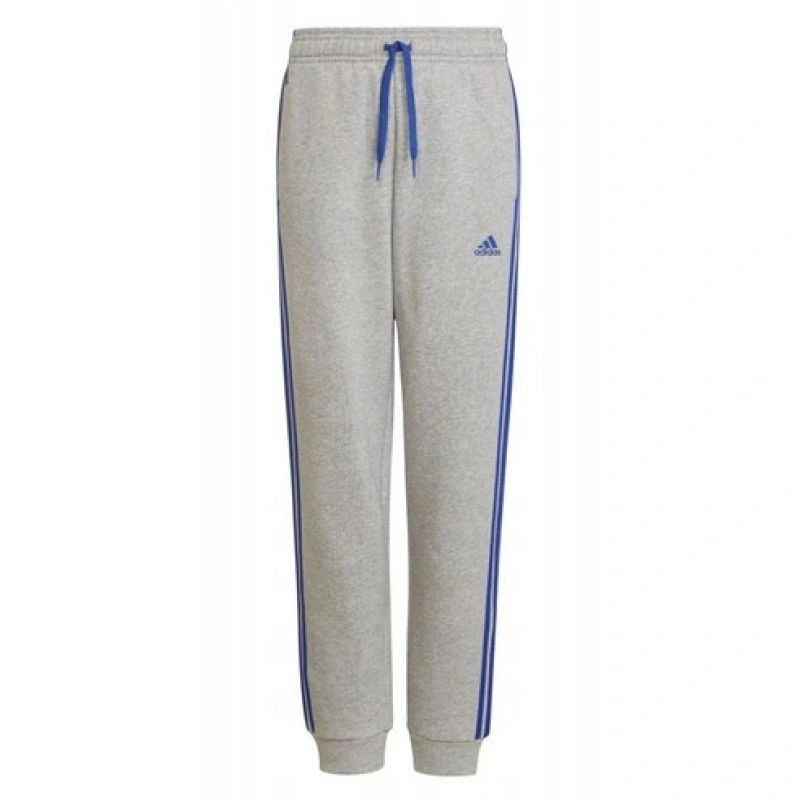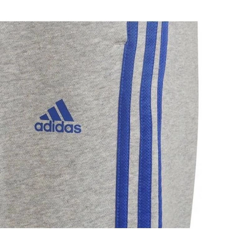 - Módní tepláky adidas v šedé barvě s modrými pruhy a logem.