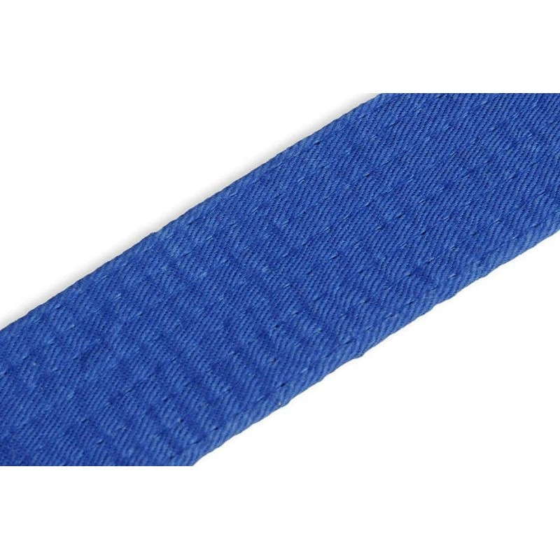 Modrý opasek pro kimona používaná v bojových sportech vyrobený z materiálu, který je směsí polyesteru a bavlny pro odolnost proti oděru a roztržení.