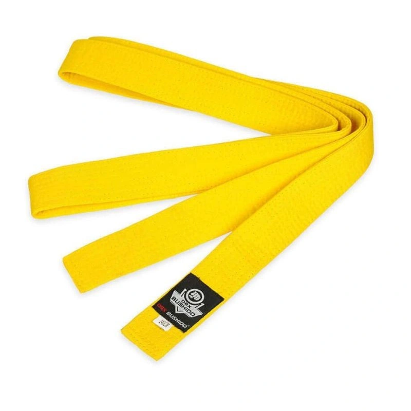 Žlutý pásek pro kimona používaná v bojových sportech vyrobený z materiálu, který je směsí polyesteru a bavlny pro odolnost proti oděru a roztržení.