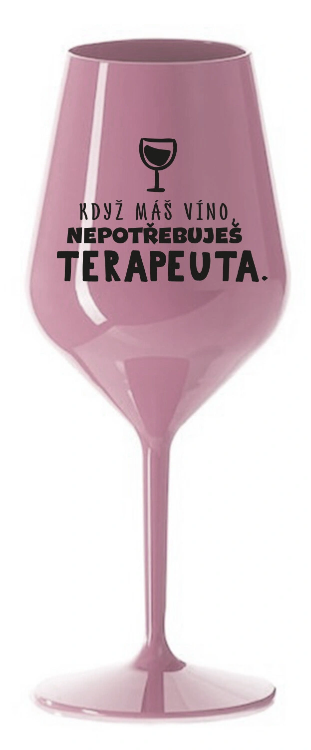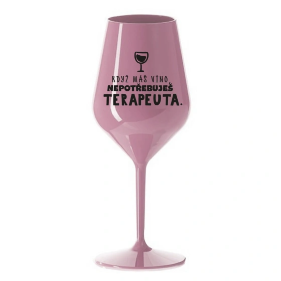 KDYŽ MÁŠ VÍNO, NEPOTŘEBUJEŠ TERAPEUTA - světle růžová nerozbitná sklenice na víno 470 ml
