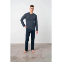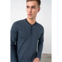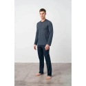 Pohodlné dvoudílné pánské pyžamo pro kvalitní spánek a volný čas. Komplet sestává z trika dlouhým rukávem, výstřihem do V a knoflíkovou légou, který doplňují dlouhé jednobarevné kalhoty. Toto pánské pyžamo je vyrobené z vysoce kvalitní, genetický nemodifikované řecké bavlny, která poskytuje vysoké pohodlí, příjemný pocit na dotek, prodyšnost, pružnost a odolnost.