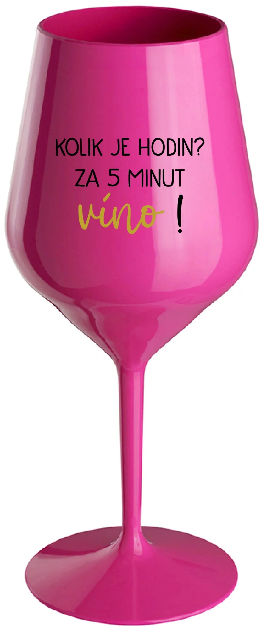 Nerozbitná růžová vinná sklenice s motivem KOLIK JE HODIN? ZA 5 MINUT VÍNO! je skvělá na zahradu, pláž, výlet, piknik a parádu udělá i při kempování. Jelikož je vyrobená z kvalitního polykarbonátu je de facto nerozbitná. Je to luxusní kousek, s nímž si víno můžete vychutnat prostě kdekoliv. Mají ergonomický tvar, který příjemně padne do ruky a protože je lehká, usnadňuje to její přenášení. Je snadno skladovatelná a lehce se čistí. Díky svému designu si s ní můžete vychutnat doopravdy kdekoliv bezproblémové pití výborného vína.