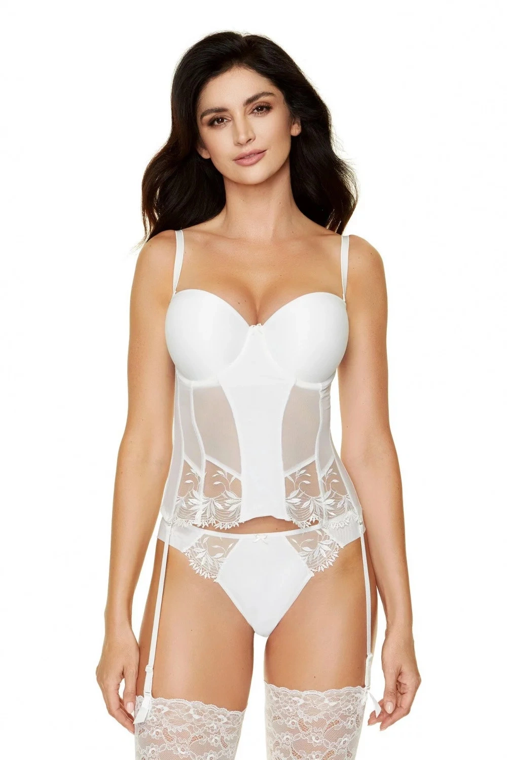 Elegantní korzet s push-up košíčky krásně tvaruje postavu a zvýrazňuje prsa. Spodní prádlo je zdobeno fenomenálními vyšívanými prvky. Bezešvé jednodílné šálky tepelně tvarované. Vnitřní část košíčků je vycpaná bavlnou. Uvnitř košíčků jsou vyjímatelné push-up vycpávky umístěné ve speciálních kapsách. Odnímatelné, nastavitelné ramenní popruhy. Dvoustupňové zapínání s řadou háčků. Odnímatelné, nastavitelné ramenní popruhy. Svislé boční velrybí kostice tvarují pas a zabraňují bočnímu řasení.