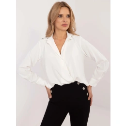 Padavá dámská košile, ve přední spodní části na gumu, vepředu sešitá. Zapínání na jeden knoflík.