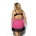 Jemná noční košilka se vzdušným střihem, doplněná pohodlnými kalhotkami. Má měkké, tvarované košíčky bez podšívky, ušité z dvouvrstvého tylu. Za pozornost stojí barevné provedení: černá a fuchsiová. Bez ramínek, nastavitelná, zapínání vzadu na háčky a očka. Komplet je konečně k dostání i ve větších velikostech. Jeden z nejlepších polských výrobců spodního prádla.