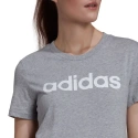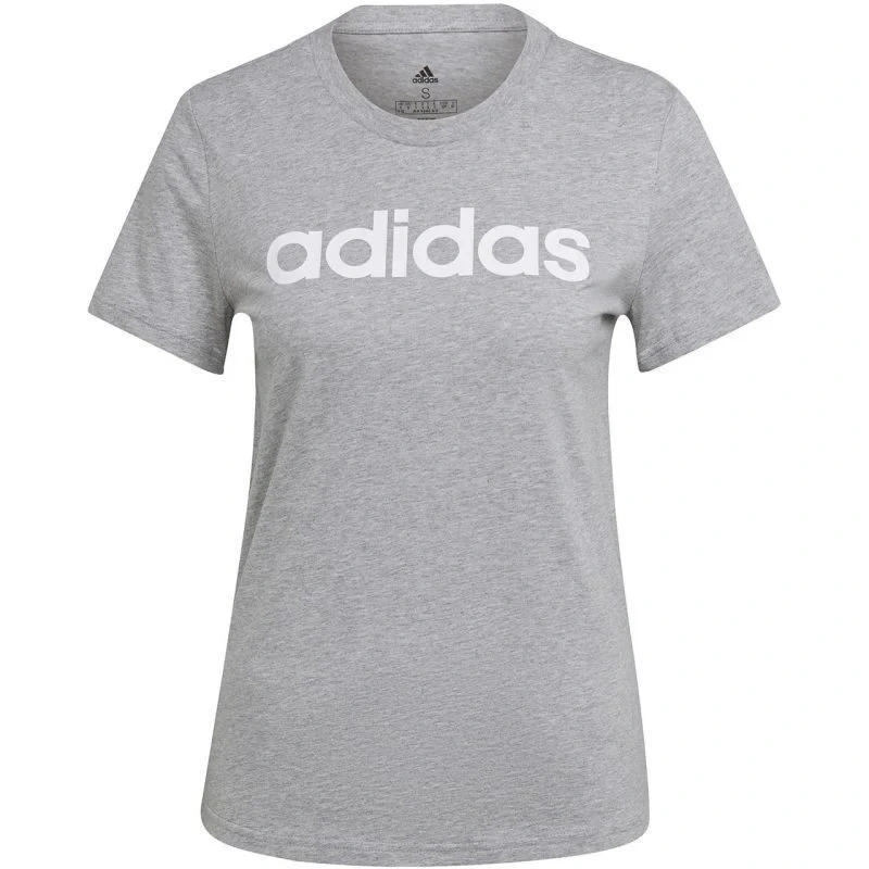- Dámské šedé tričko adidas s velkým tištěným logem na hrudi a zaobleným výstřihem.