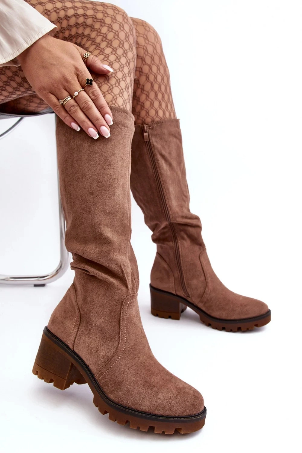 Dámské boty s nártem před kolenem. Vyrobené z ekokůže. Zapínání na zip. Posazené na nízkém masivním podpatku. Vyztužený podpatek. Zaoblená špička. Využijete je v mnoha stylizacích! Musí být vaše!