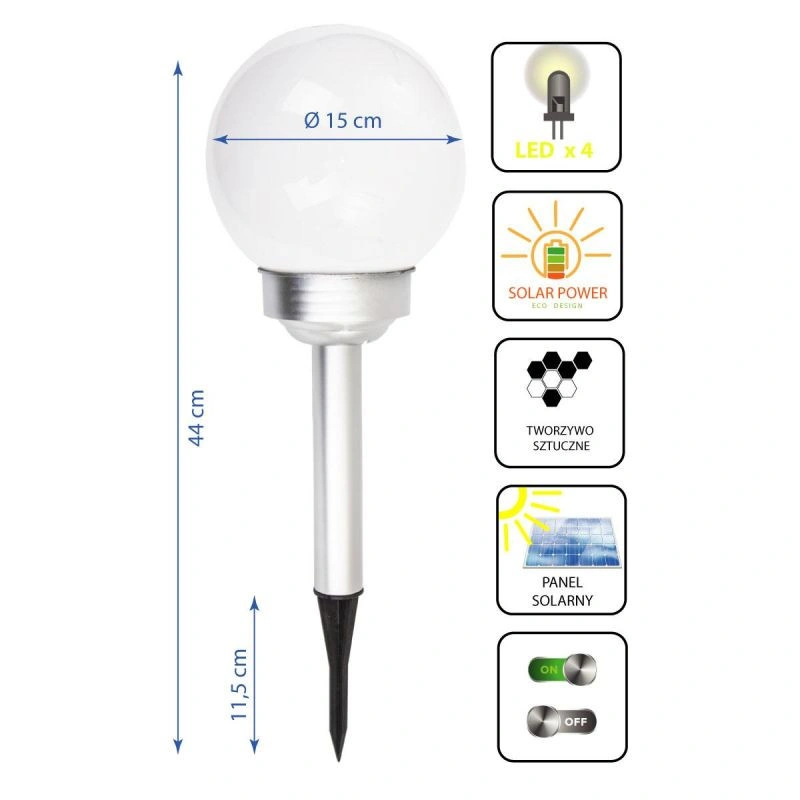 LAMPA SOLARNA KULA MLECZNA 15X44CM to praktyczne i niedrogie źródło światła, które sprawdzi się przede wszystkim na zewnątrz. Możesz ją wykorzystać jako podświetlenie elewacji, trawnika, tarasu, balkonu, podjazdu, basenu czy też do podświetlenia altanki lub chodnika. Wystarczy tylko wbić gruby grot w podłoże w odpowiednio oświetlonym miejscu. Sercem lampy jest panel solarny ukryty pod kloszem, którego zadaniem jest gromadzenie energii ze słońca w ciągu dnia i przechowywanie jej w akumulatorze. Energia jest uwalniana w postaci światła dopiero gdy na zewnątrz zapadnie zmierzch. Odpowiedzialny za to jest wbudowany czujnik zmierzchu. To praktycznie darmowa i ekologiczna forma oświetlenia płacisz jedynie za lampę. LAMPA SOLARNA KULA MLECZNA 15X44CM sprawdzi się też w miejscach, gdzie nie masz możliwości założenia instalacji elektrycznej, a chciałbyś je nieco rozświetlić. Jej WODOODPORNA obudowa sprawi, że będzie rozświetlać co tylko zechcesz przez długi czas.