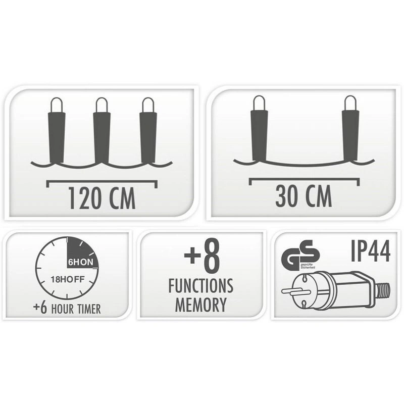 Díky 5metrovému kabelu a integrovanému časovači 6/18 se záclona rozsvítí, kdy chcete - není třeba ji zapínat každý den. Stačí jednou nastavit a světlo si můžete užívat po celou sezónu.
