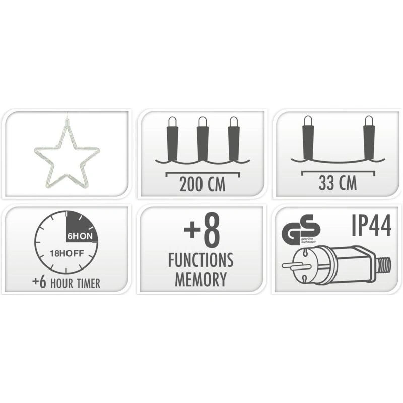 Díky 5metrovému kabelu a integrovanému časovači 6/18 se záclona rozsvítí, kdy chcete - není třeba ji zapínat každý den. Stačí jednou nastavit a můžete si užívat světlo po celou sezónu.