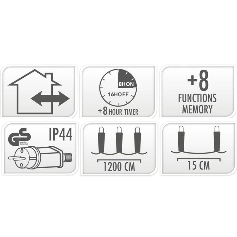 Funkce časovače zajišťuje, že po aktivaci se řetěz opakovaně rozsvítí na 8 hodin a poté se na 16 hodin vypne. Lze jej kdykoli resetovat podržením tlačítka na zástrčce po dobu několika sekund (funguje zelená kontrolka časovače).