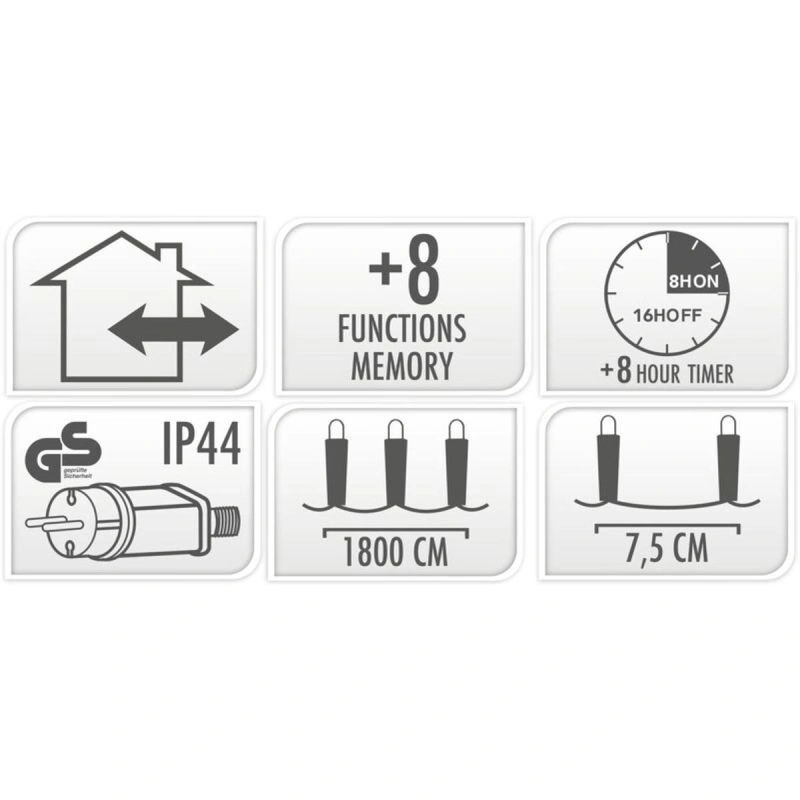 Tato bíle zbarvená světla mají na výběr z 8 různých světelných režimů, takže si můžete doma, v práci nebo na zahradě vytvořit jedinečnou a nenapodobitelnou dekoraci. Sekvence lze přepínat díky speciálnímu tlačítku na zástrčce.