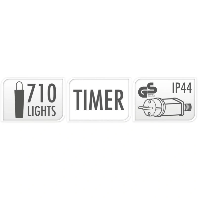 Díky až 710 LED diodám získáte rovnoměrné a husté osvětlení celého vánočního stromku, balkonu nebo stěny. Jedná se o sadu, která poskytuje prvotřídní světelný efekt při nízké spotřebě energie.