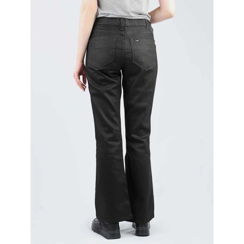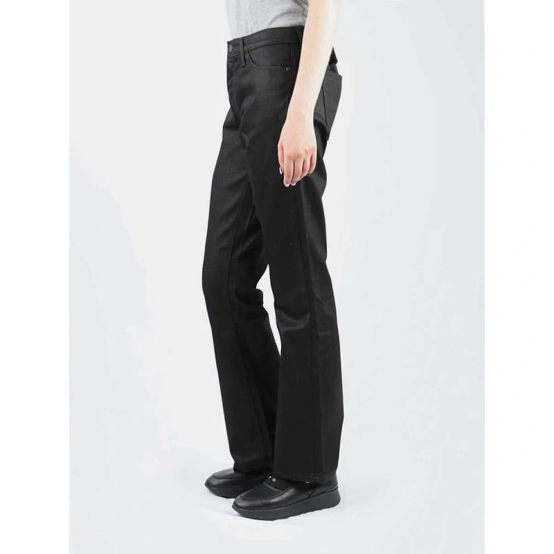 Dámské černé džínové kalhoty s nízkým pravidelným sedem a rozšířenými nohavicemi. Zapínání na zip a knoflík. Kožená nášivka na zadní straně v pase s logem výrobce.