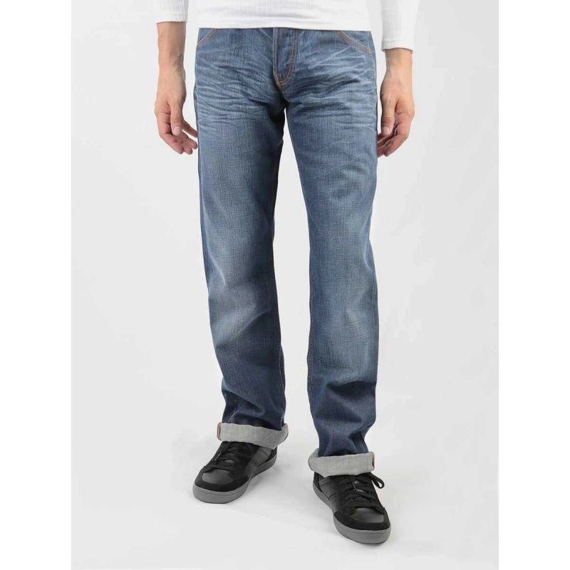 Pánské džínové kalhoty s nízkým sedem, rovnými nohavicemi, zapínáním na knoflíky a koženou nášivkou s logem na zadním pásu.