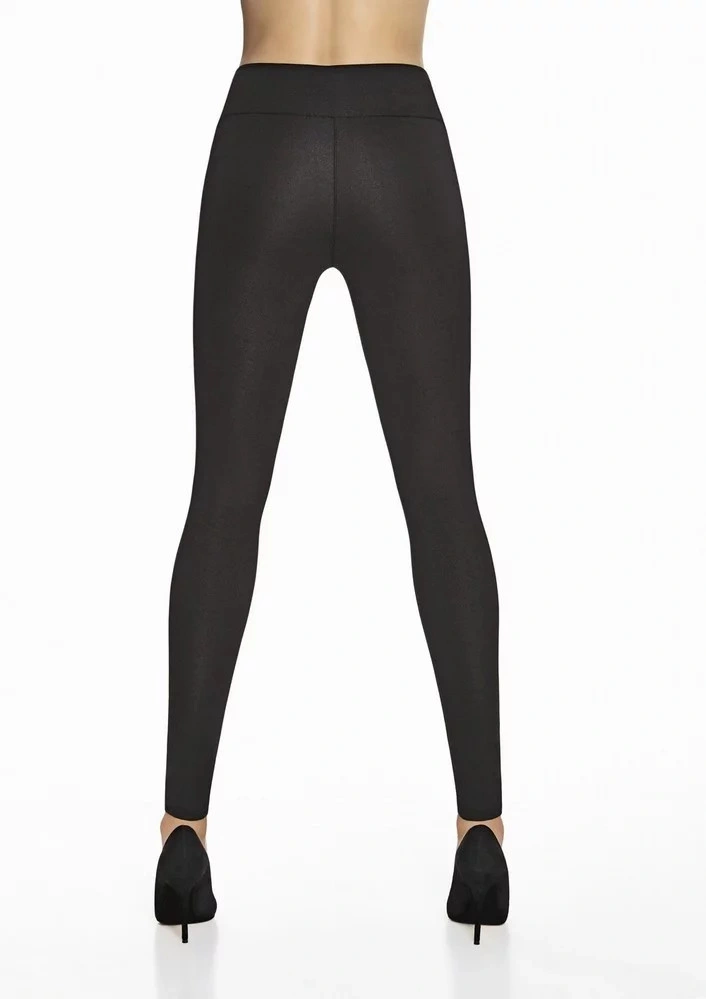 Hladké dámské legíny, které jsou vyrobené z elastanové příze. Model je matný a nemá vyznačený sed. S