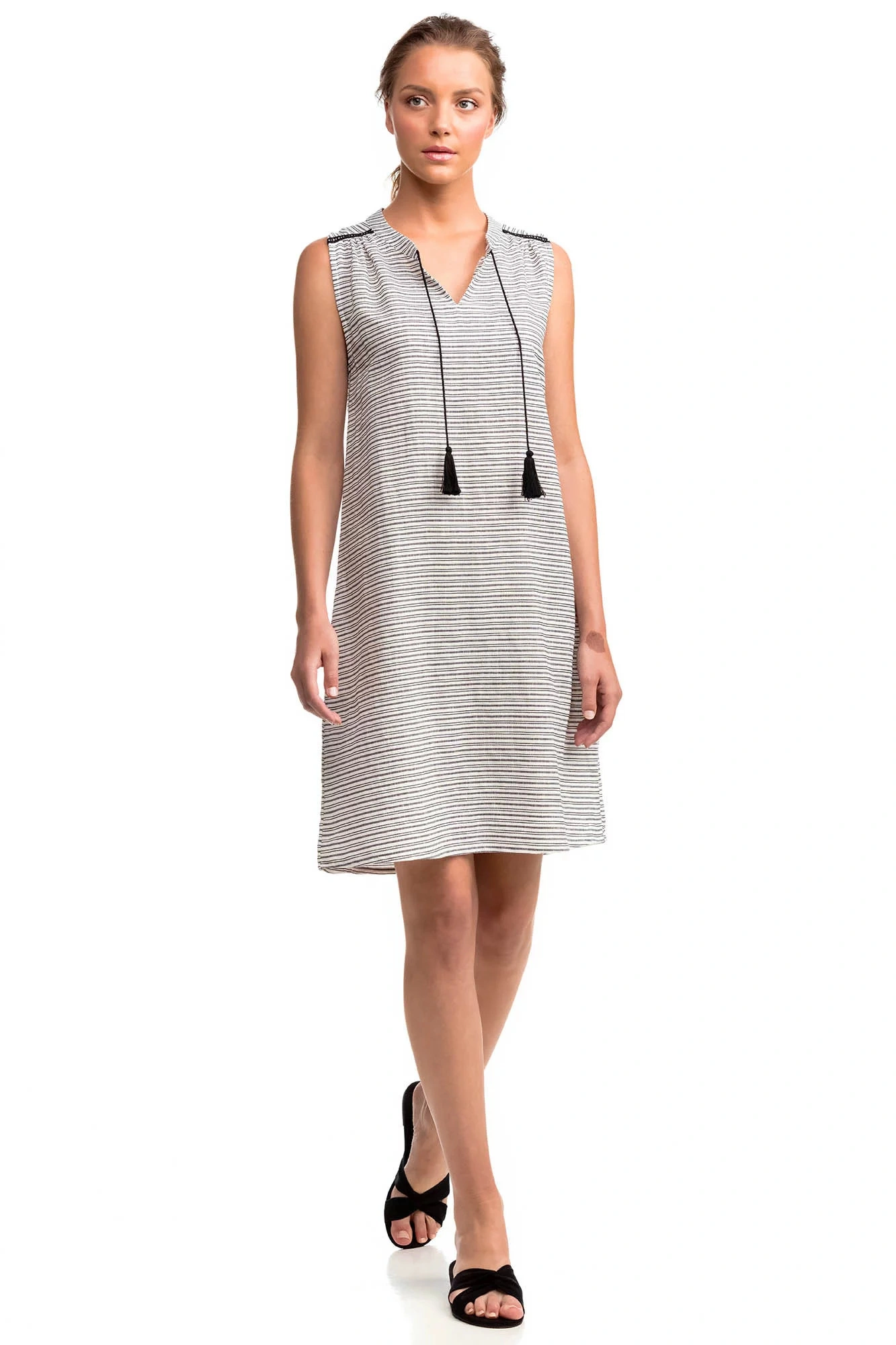 Elegantní dámké šaty s jemným proužkem, krátkým rukávem a výsřihem do V s dekorativní stahovací šňůrkou. Šaty jsou vyrobené z kvalitního bavlněného popelínu s příměsí lnu a viskózy. Bavlněný popelín i len jsou vysoce odolné a pevné, ale zároveň měkké a na dotek příjemné tkaniny. Materiál se vyznačuje vysokou savostí, termoregulací a antialergickými vlastnostmi. Viskóza pak dodává tkanině příjemnou chladivost ideální pro teplé letní období.