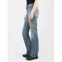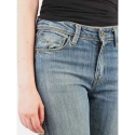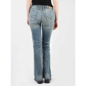 Dámské džínové kalhoty s nízkým sedem, širokými nohavicemi, zapínáním na zip a knoflík, koženou nášivkou na zadním pásu.