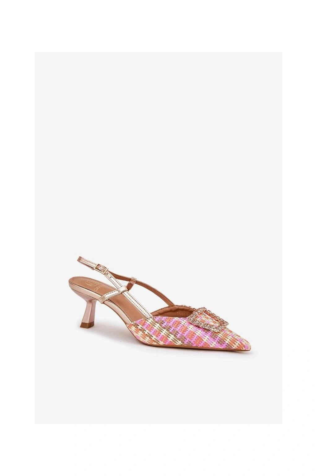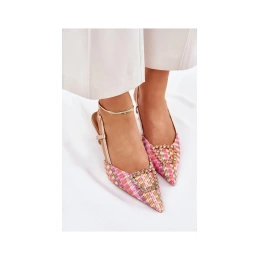 Dámské lodičky s odkrytou patou, které okouzlí svým vzhledem. Model s špičatými špičkami opticky prodlužuje nohy a ozdoba vpředu jim dodává zvláštní šarm. Zapínání na nastavitelný pásek s přezkou zajišťuje pohodlí a skvělé přizpůsobení. Ideální volba pro večerní výlety a speciální příležitosti.