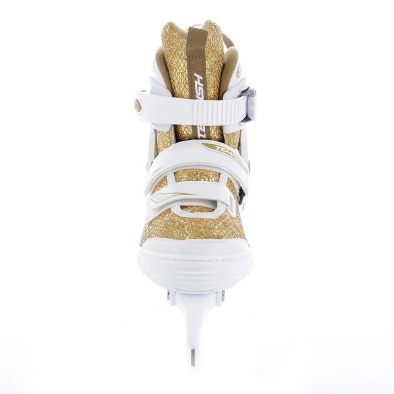 Łyżwy/Rolki Regulowane TEMPISH Enbo Duo Girl Gold TEMPISH Enbo Duo Girl Gold to regulowane łyżwy dziecięce stworzone z myślą o całorocznej rekreacyjnej jeździe. Dzięki innowacyjnej konstrukcji, te łyżwy umożliwiają wymianę ostrzy na kółka, co pozwala na korzystanie z nich zarówno na lodzie, jak i na asfalcie, oferując nieograniczone możliwości zabawy. Główne cechy: Podwójna Konstrukcja: Zostały zaprojektowane z myślą o wszechstronności. Z łatwością można je przekształcić z łyżew w rolki poprzez poluzowanie trzech śrub. To funkcjonalne rozwiązanie pozwala na korzystanie z nich przez cały rok, niezależnie od sezonu. Elastyczna Rama: Rama pozostaje elastyczna nawet w ekstremalnych temperaturach do -20°C. Łyżwy są idealne do rekreacyjnej jazdy na lodzie, a także do jazdy na rolkach na świeżym powietrzu. Ich wytrzymałość w niskich temperaturach gwarantuje niezawodność w każdych warunkach. Komfort i Wsparcie: Miękka, szybkoschnąca podszewka zapewnia wygodę