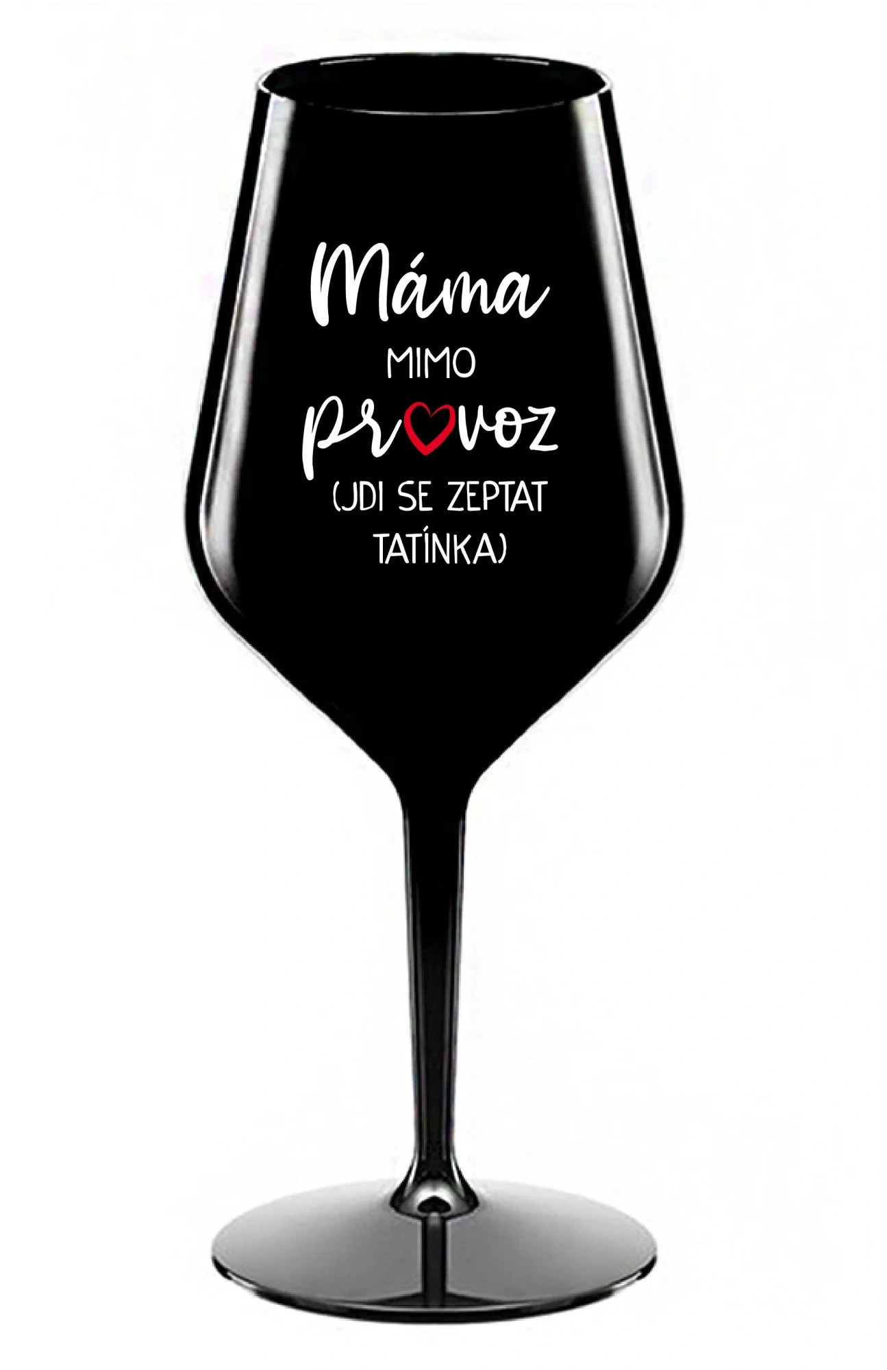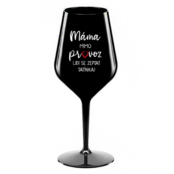 Nerozbitná černá vinná sklenice s motivem MÁMA MIMO PROVOZ (JDI SE ZEPTAT TATÍNKA) je skvělá na zahradu, pláž, výlet, piknik a parádu udělá i při kempování. Jelikož je vyrobená z kvalitního polykarbonátu je de facto nerozbitná. Je to luxusní kousek, s nímž si víno můžete vychutnat prostě kdekoliv. Mají ergonomický tvar, který příjemně padne do ruky a protože je lehká, usnadňuje to její přenášení. Je snadno skladovatelná a lehce se čistí. Díky svému designu si s ní můžete vychutnat doopravdy kdekoliv bezproblémové pití výborného vína.