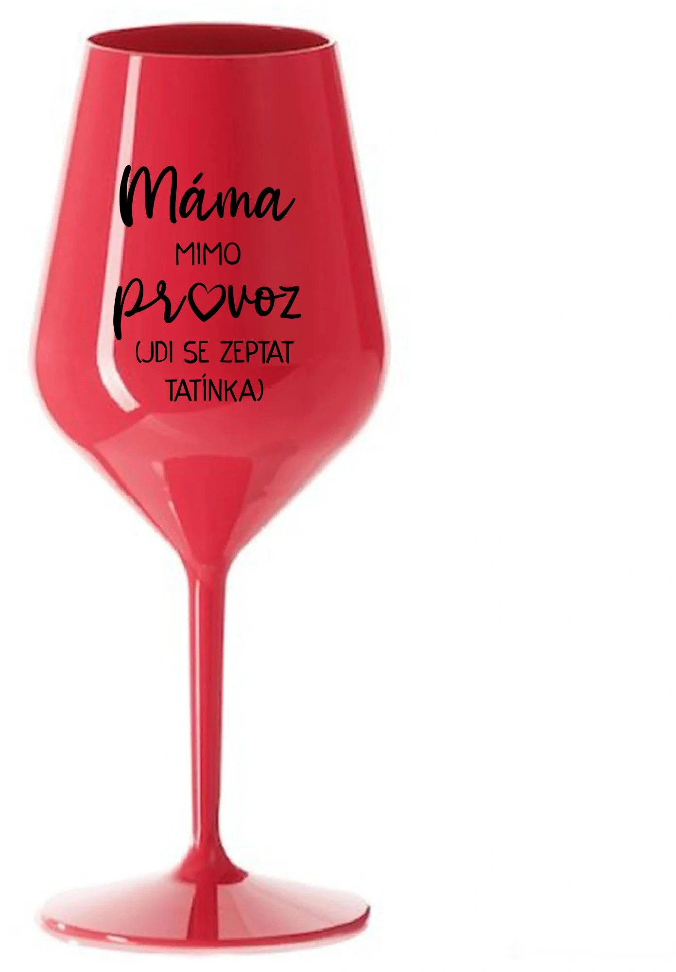 Nerozbitná červená vinná sklenice s motivem MÁMA MIMO PROVOZ (JDI SE ZEPTAT TATÍNKA) je skvělá na zahradu, pláž, výlet, piknik a parádu udělá i při kempování. Jelikož je vyrobená z kvalitního polykarbonátu je de facto nerozbitná. Je to luxusní kousek, s nímž si víno můžete vychutnat prostě kdekoliv. Mají ergonomický tvar, který příjemně padne do ruky a protože je lehká, usnadňuje to její přenášení. Je snadno skladovatelná a lehce se čistí. Díky svému designu si s ní můžete vychutnat doopravdy kdekoliv bezproblémové pití výborného vína.