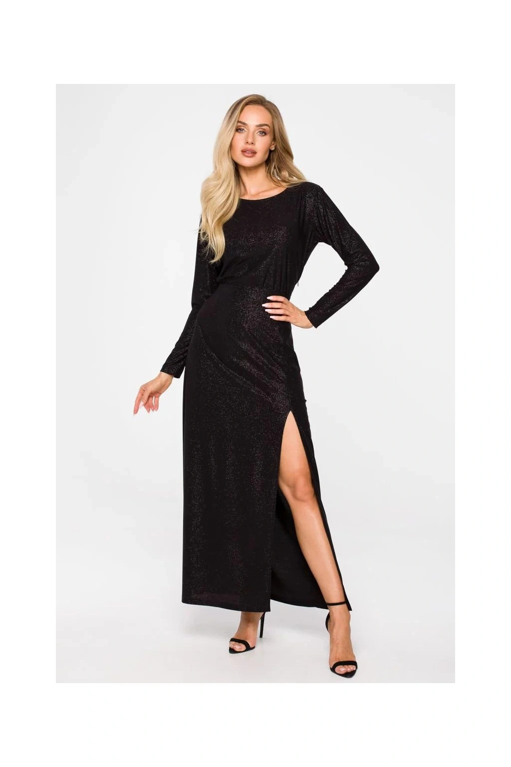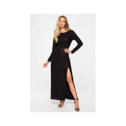 Jednoduché a chic - plesové šaty z třpytkové látky! Úzký top s dlouhými rukávy, vycpávkami na ramenou a velkým kulatým výstřihem, široká splývavá sukně s vysokým rozparkem. Třpytivý materiál.