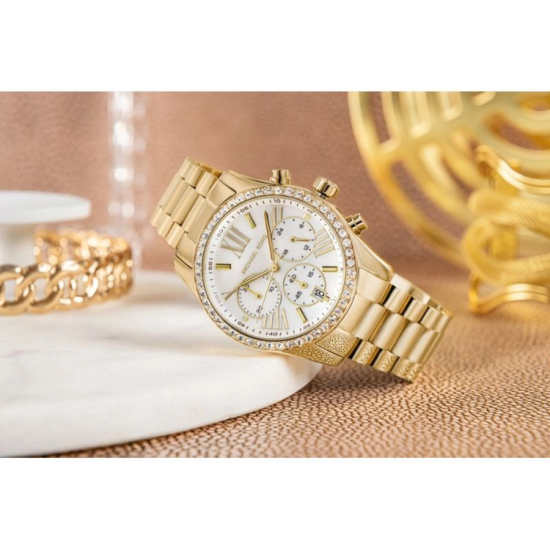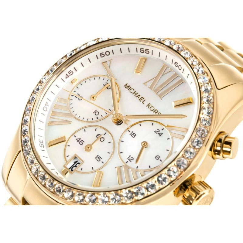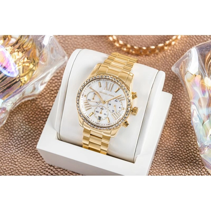 Dámské hodinky Michael Kors Lexington MK7241 jsou typickým příkladem luxusu a nadčasového stylu. Hodinky v klasickém zlatém odstínu zaujmou na první pohled svým jemným leskem a elegantním provedením. Kulaté pouzdro a sladěný náramek z nerezové oceli tvoří celek připomínající šperk, který dodá každému vzhledu punc noblesy. Perleťový ciferník s indexy a funkcí chronografu kombinuje styl a praktičnost, zatímco ozdobný rámeček kolem ciferníku dodává hodinkám jedinečný charakter. Hodinky Michael Kors Lexington MK7241 pohání přesný quartzový strojek, který zaručuje spolehlivý výkon den co den. Ideální volba pro ženy, které rády září na úrovni - elegantní, sofistikované a vždy módní.