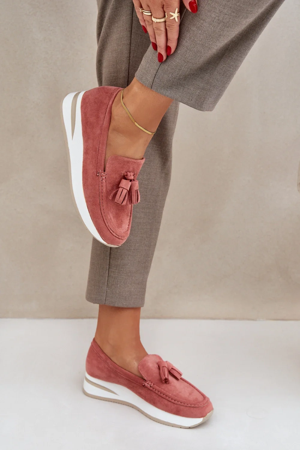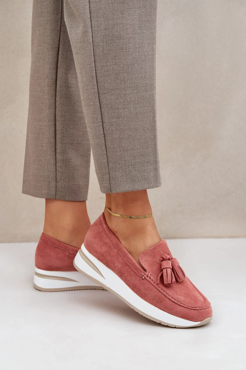 Mokasíny vyrobené z ekologického semiše. Umístěné na platformě a jemném podpatku poskytují pohodlí a lehkost siluetě. Kulaté špičky dělají obuv velmi pohodlnou a měkká vložka pečuje o pohodlí po celý den. Celkový vzhled doplňují ozdobné řasy, které dodávají originální charakter a styl. Ideální pro každodenní outfity!