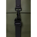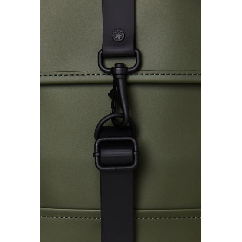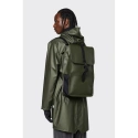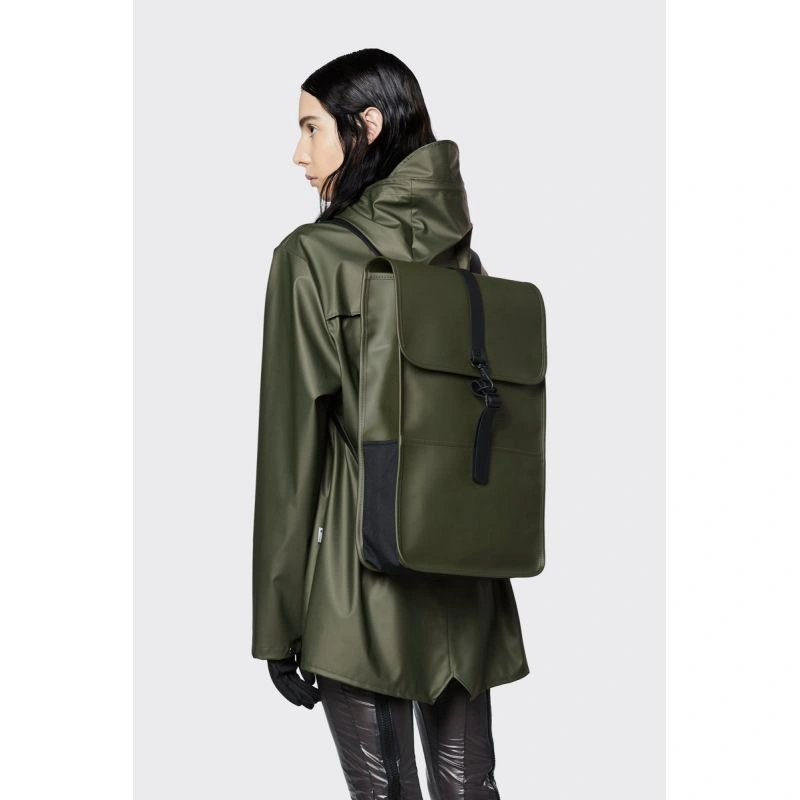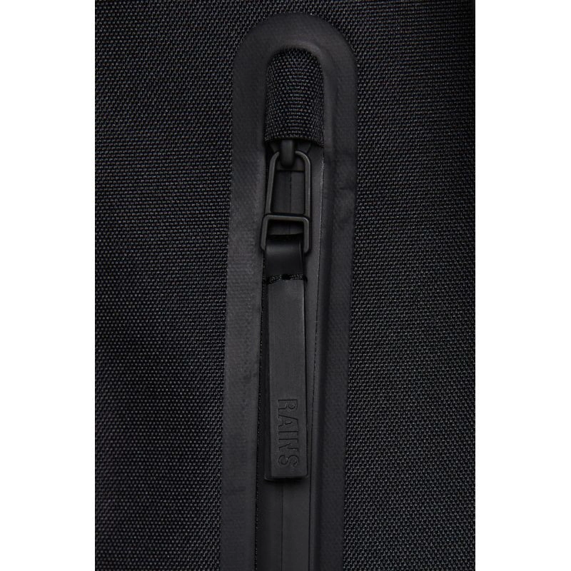 Batoh je vyroben z charakteristické voděodolné PU tkaniny Rains, navržené pro pevnost, odolnost a hladký omak.