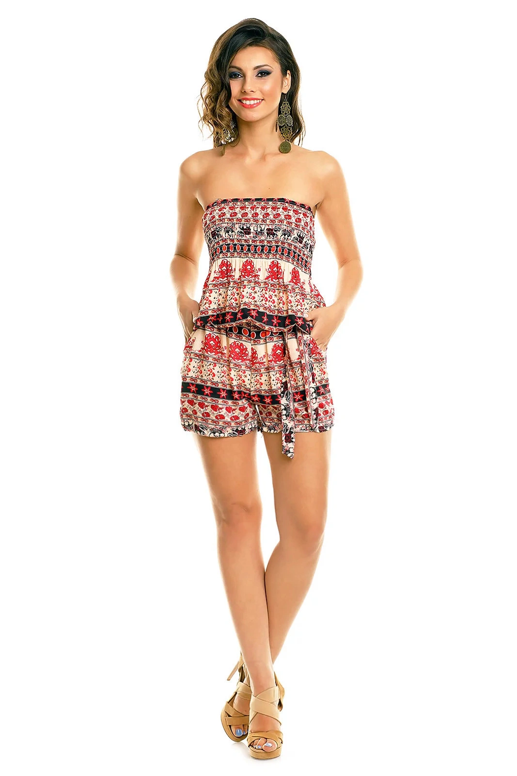 Overal dámský šortkový Airisa se vzorem květin. Model má jednoduchý střih. Je bez ramínek a rukávů a v pase a na prsou má gumu. Overal má dvě vnější kapsy a je možné ho nosit s páskem ve stejné barvě. Tento jednoduchý overal je vhodný na léto a pro volný čas. Overal je vyroben z příjemného materiálu. Má moderní vzhled.