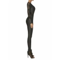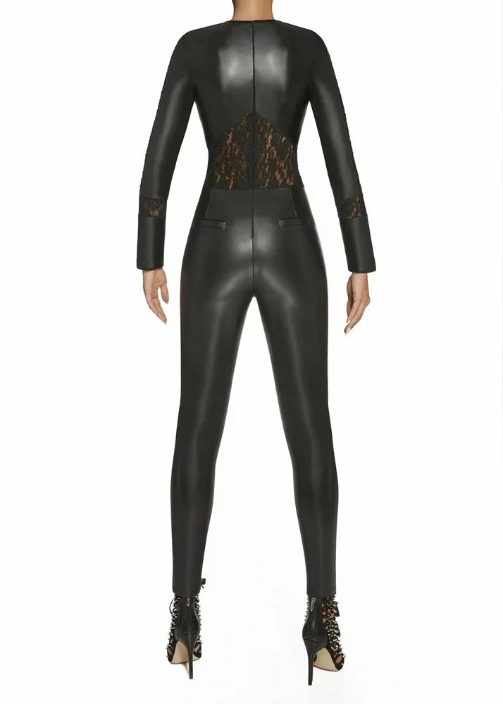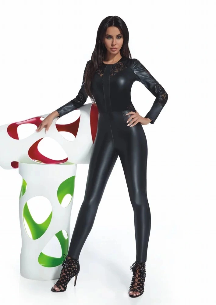 Sexy kombinéza, která je vyrobená z eko kůže a svůdné krajky. Kombinéza má kulatý výstřih, dlouhé rukávy a vzadu se zapíná na zip. V zadní části jsou umístěné patky imitující kapsičky. Jemnost: 200 DEN.Materiál ECO-LEATHER imituje kůži, je plně kryjící, elastický a modeluje postavu. Tento materiál je vyrobený z přízí renomovaných producentů s mezinárodním certifikátem Oeko-Tex.