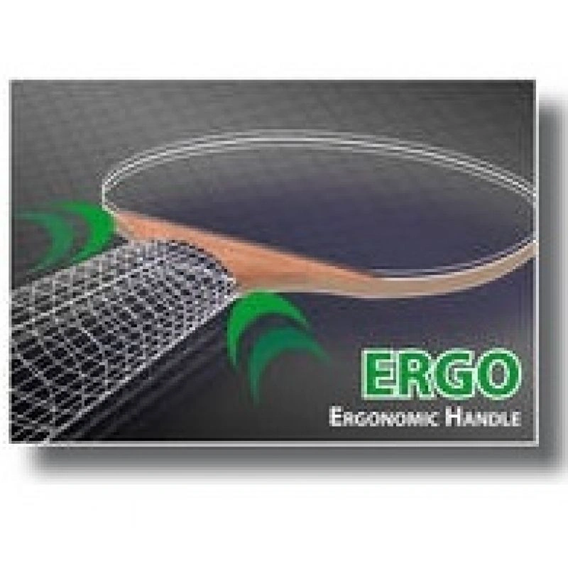 ErgonomickárukojeťERGO (Ergonomic Handle ) - ergonomická rukojeť, která díky vylepšené dřevěné části rukojeti a rakety dokonale padne do ruky - působí jako jeden celek, netlačí na ruku a poskytuje mimořádně pohodlný a příjemný pocit z držení