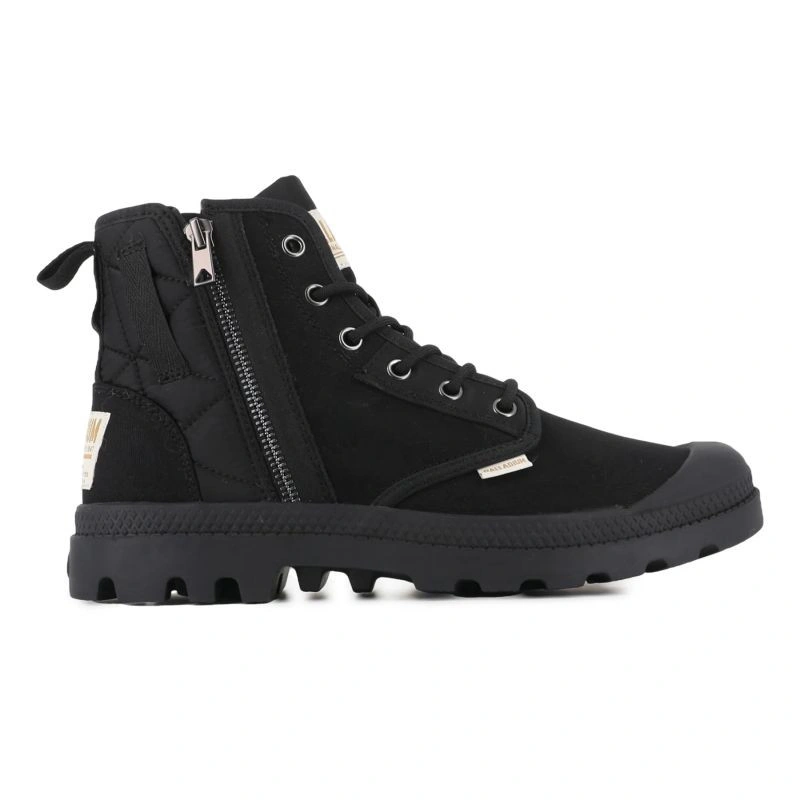 Bota je vybavena zpevněním paty, poutkem v zadní části a značkou Palladium - nášivkou na jazyku a logem na svršku. Strobelová trvanlivá konstrukce zajišťuje dobrou pružnost a kontakt se zemí. Jedná se o návrh městské obuvi s výrazným charakterem, která je vhodná pro každodenní použití i outdoorovou stylizaci.