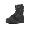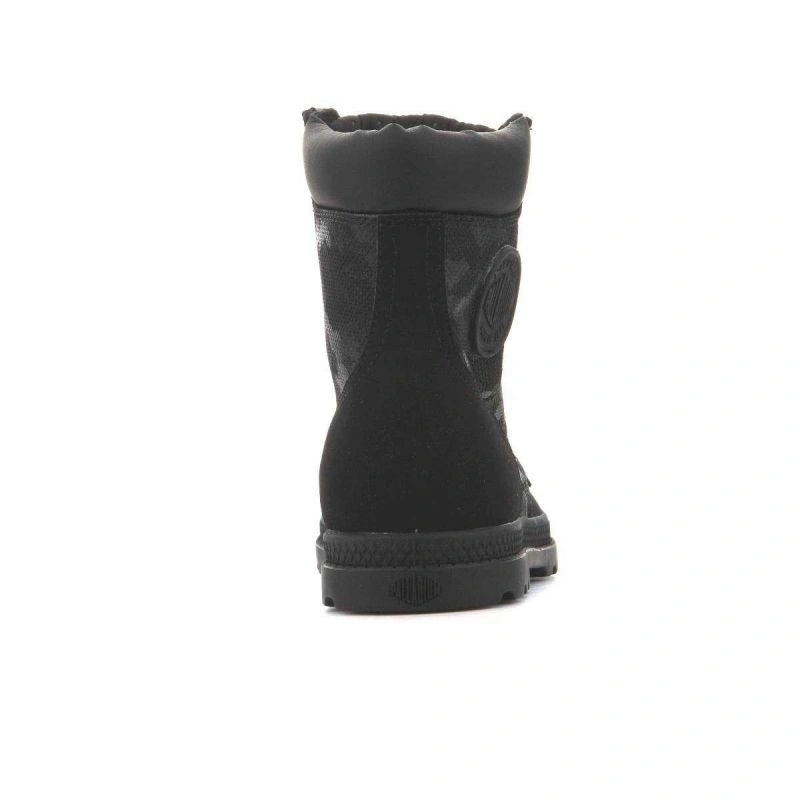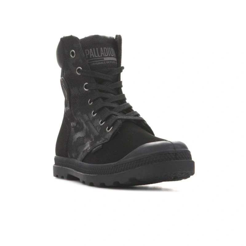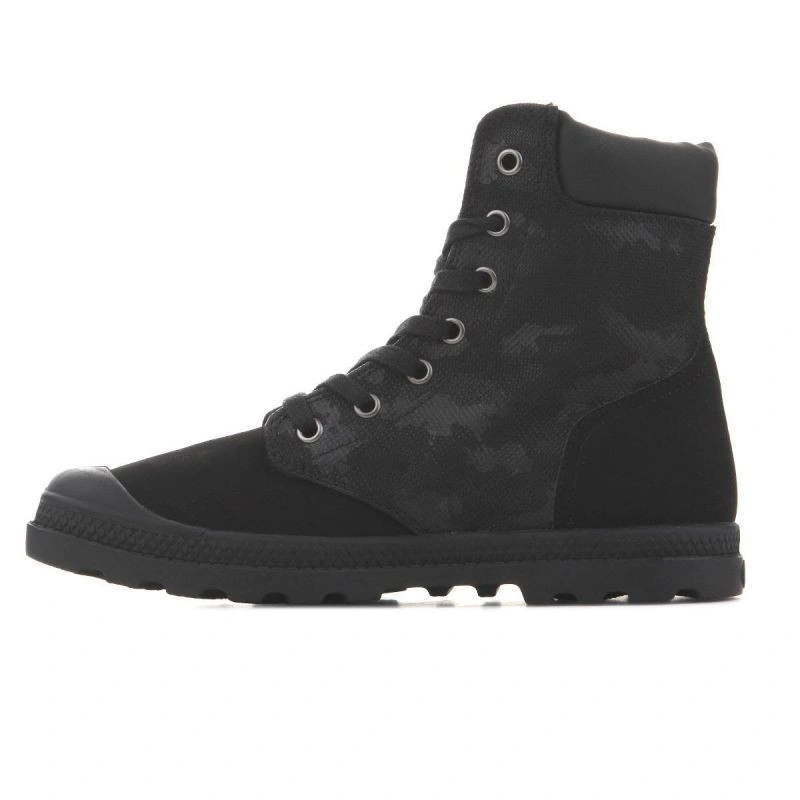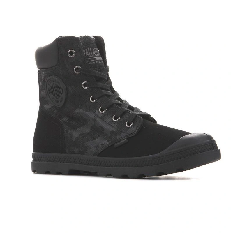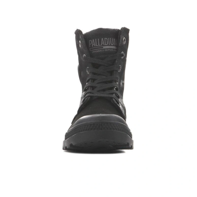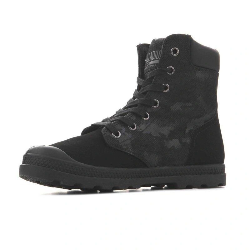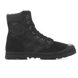 Vysoký svršek na šněrování a kulatá vyztužená přední část. Svršek je vyroben ze dvou různých textilních materiálů pro originalitu. Stélka je vyrobena z textilního materiálu. Pevná a odolná podrážka z kvalitního plastu zaručuje dobrou pružnost a přilnavost díky širokému běhounu. Komfort a pohodlí. Logo Palladium na boku, na jazyku a vzadu na podrážce.