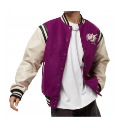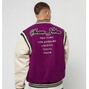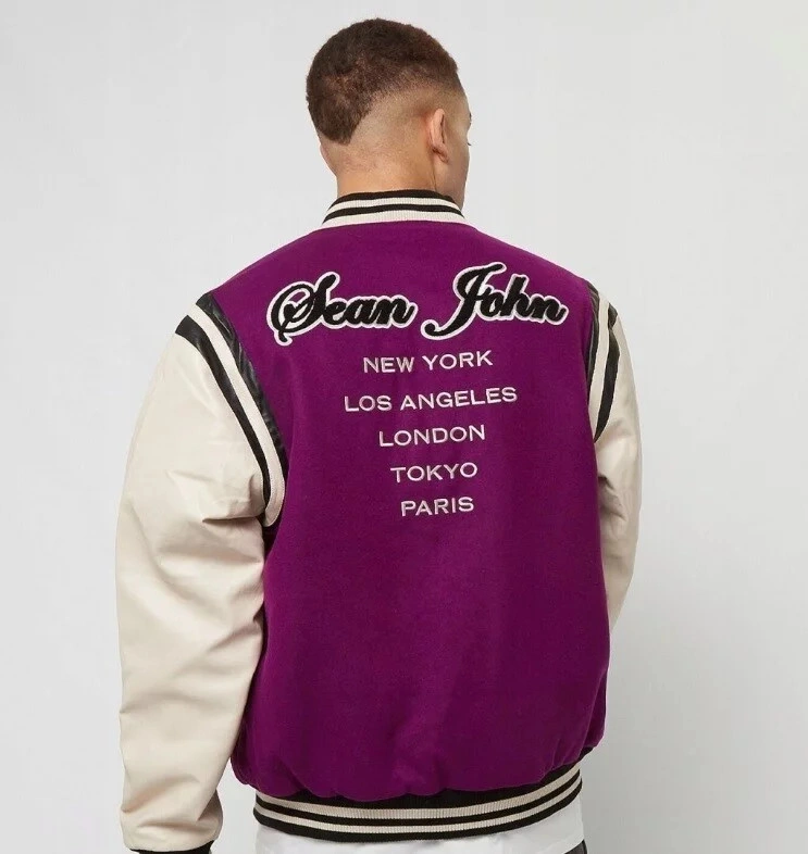 Pánská tříbarevná bunda s nápisem na zádech a nálepkou na prsou.