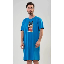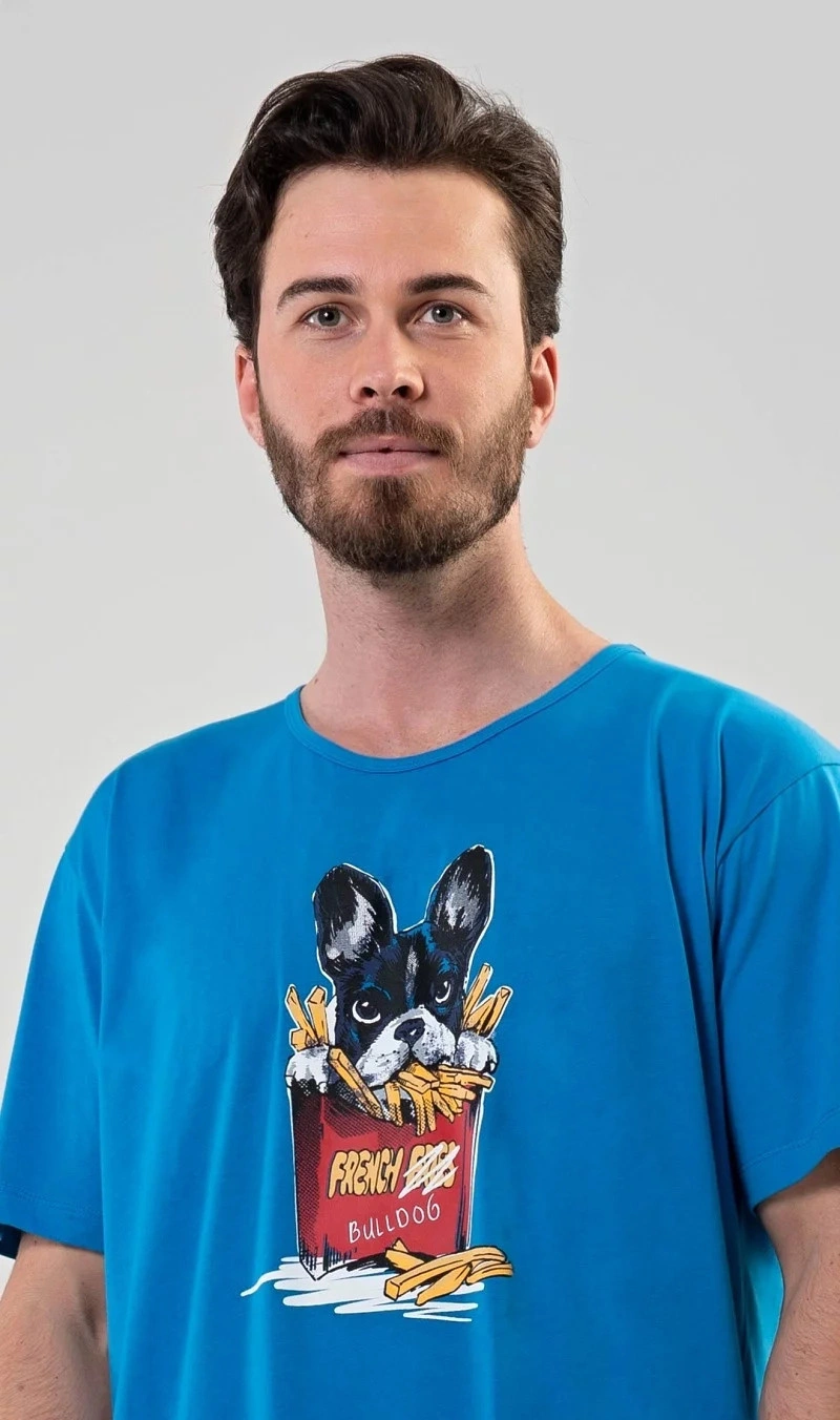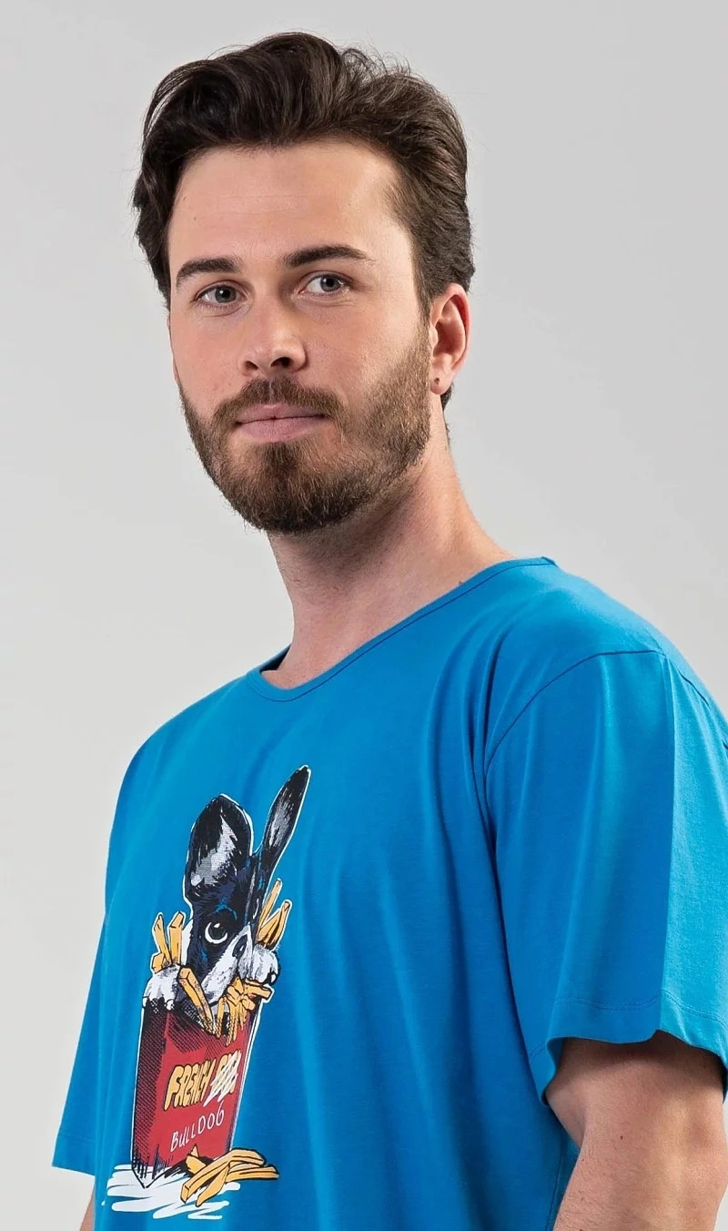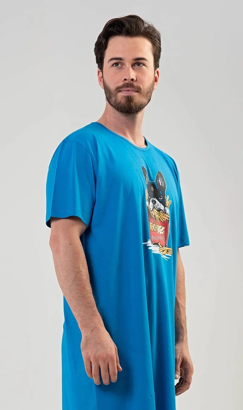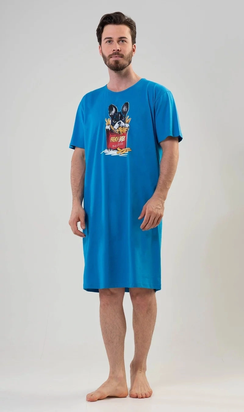 Pánská noční košile s krátkým rukávem Bulldog. Pánská noční košile s obrázkem Bulldoga v hranolkách je určena pro všechny milovníky pohodlí. Použitý materiál je jemný a poddajný na dotek. Obsah bavlny je 100%.