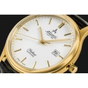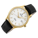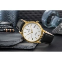 Hodinky jsou vybaveny elegantním řemínkem z kvalitní přírodní kůže v sytě černé barvě. Díky své jemné struktuře a měkkosti dokonale padne na zápěstí a zaručuje pohodlné celodenní nošení. Kožený řemínek nejen podtrhuje luxusní charakter hodinek, ale také dodává hodinkám nádech třídy a činí z modelu dokonalý doplněk pro elegantní styl i každodenní nošení. Černé tóny řemínku krásně ladí s pouzdrem ve zlaté barvě a zlatým ciferníkem a vytvářejí harmonický a výrazný celek. Pevná spona zajišťuje bezpečnost a odolná kůže je zárukou trvanlivosti a nadčasového stylu.